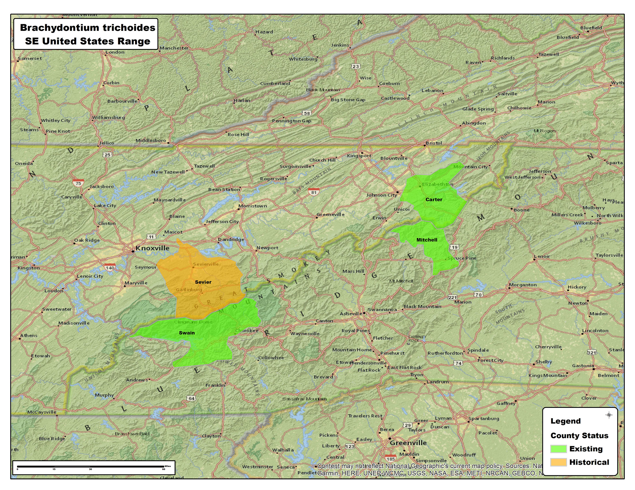 Moist acidic rock (often periodically dry in areas otherwise prone to seepage) at higher elevations, along trails and cliff faces. In the Southern Appalachians apparently restricted to elevations above 5000 ft.