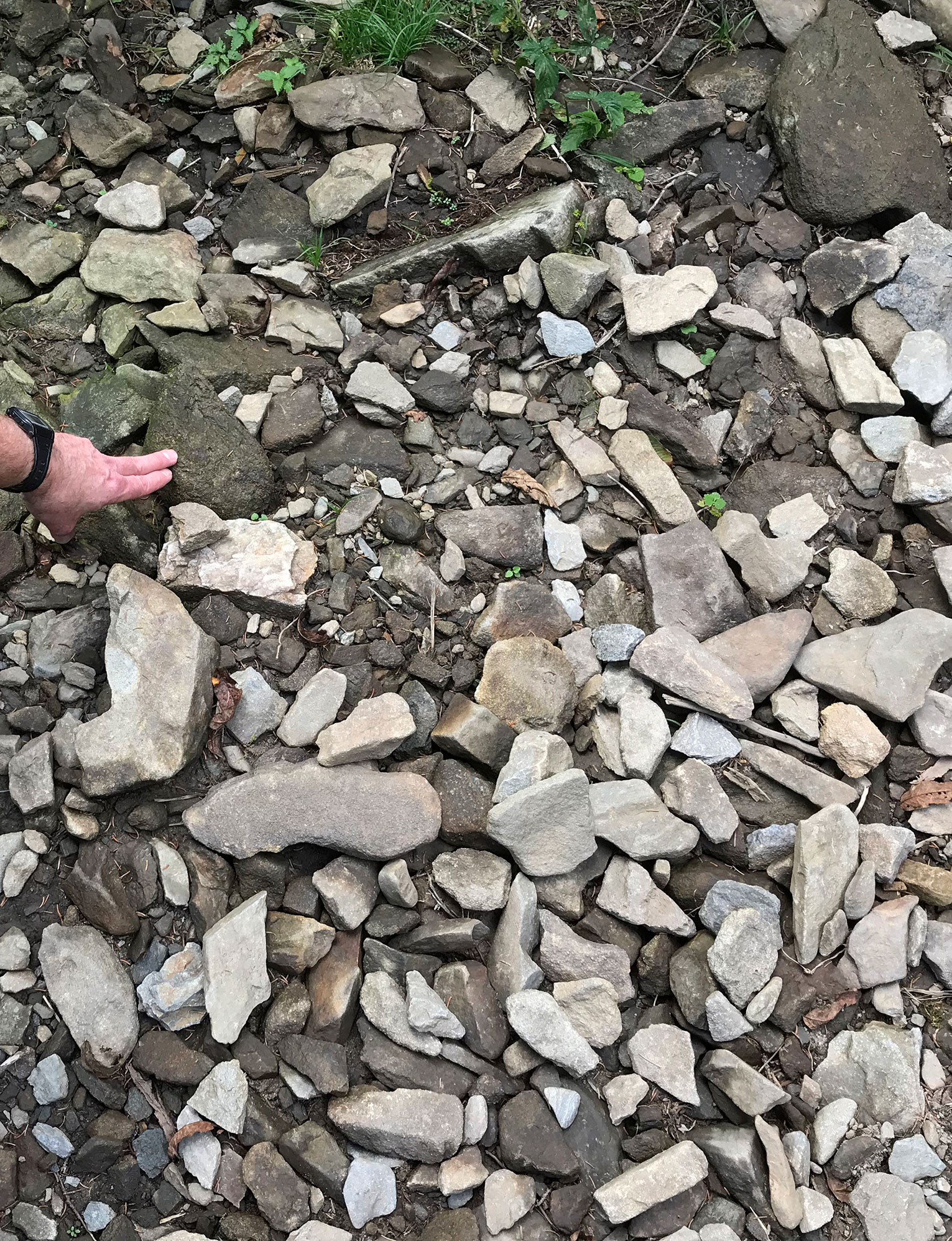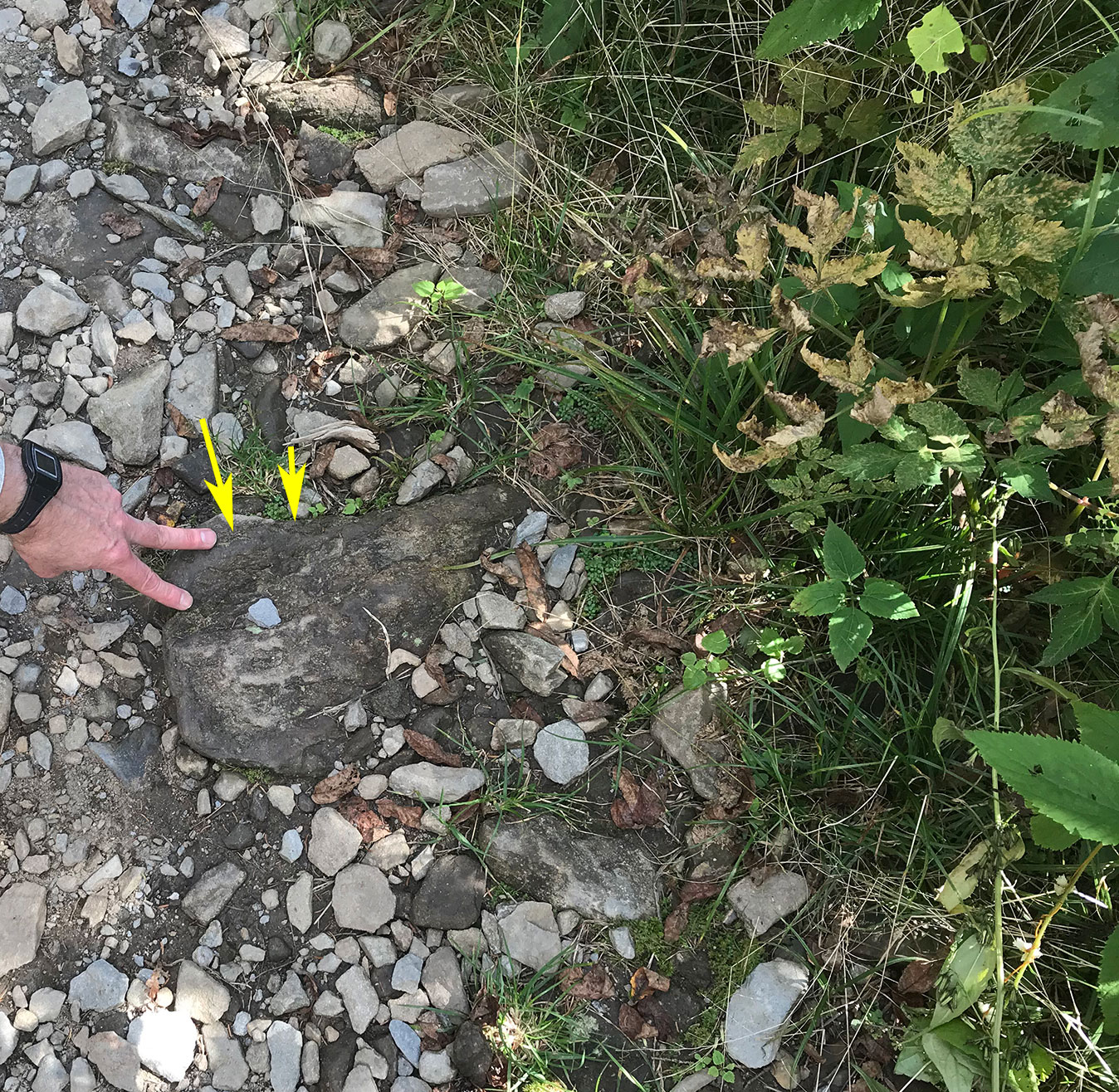 On rocks in the trail, rather dry rocks when the photo was taken.