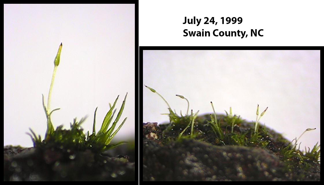 Capsules not yet fully formed in late July 1999, from same location as other photos on this page where in September of 2018, capsules are nearly mature suggesting sporophytes regularly mature in late summer/early autumn.