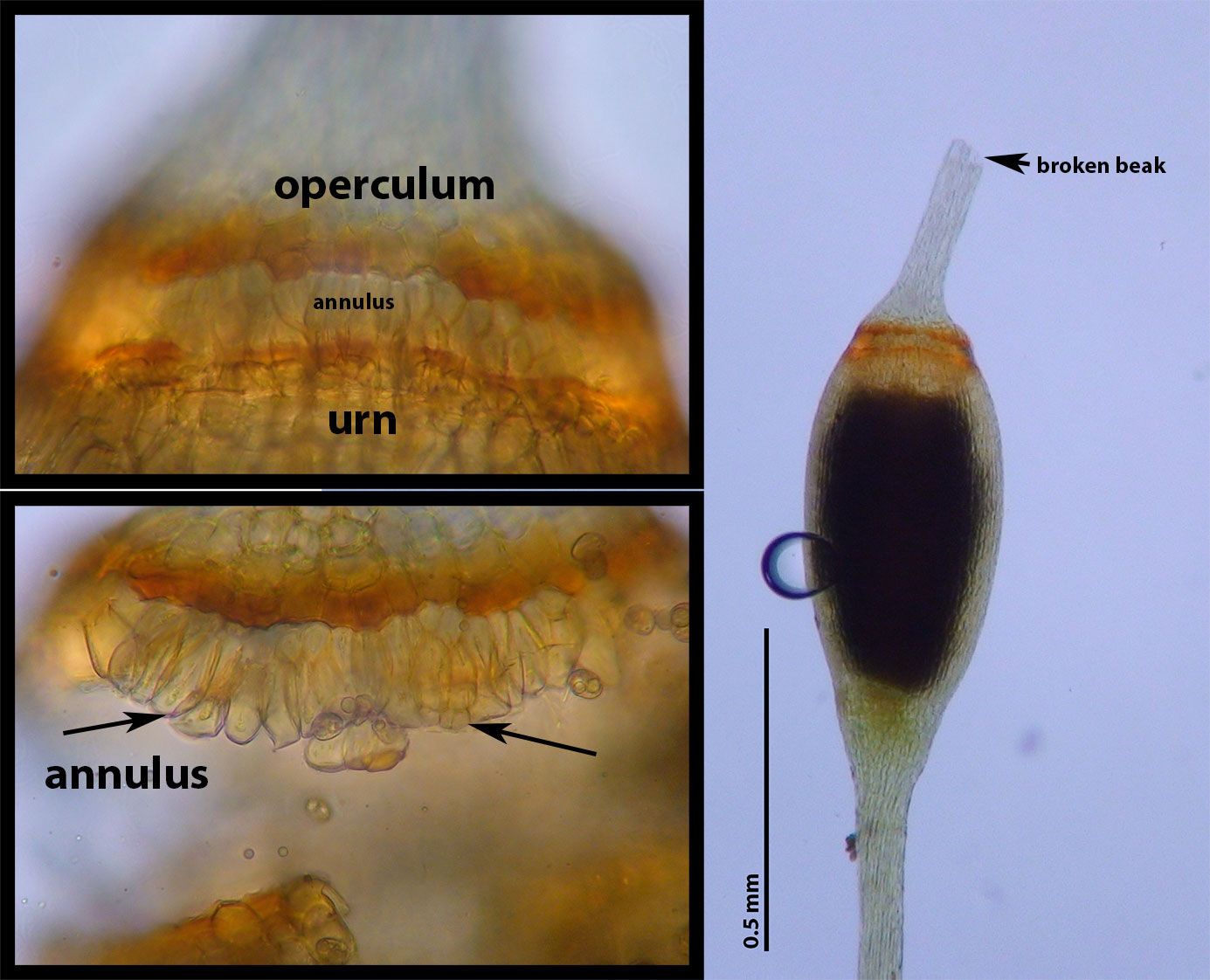The striae (ridges) of the capsule's urn are just visible in this prematurely dried capsule. The left image shows an operculum from above (beak removed).