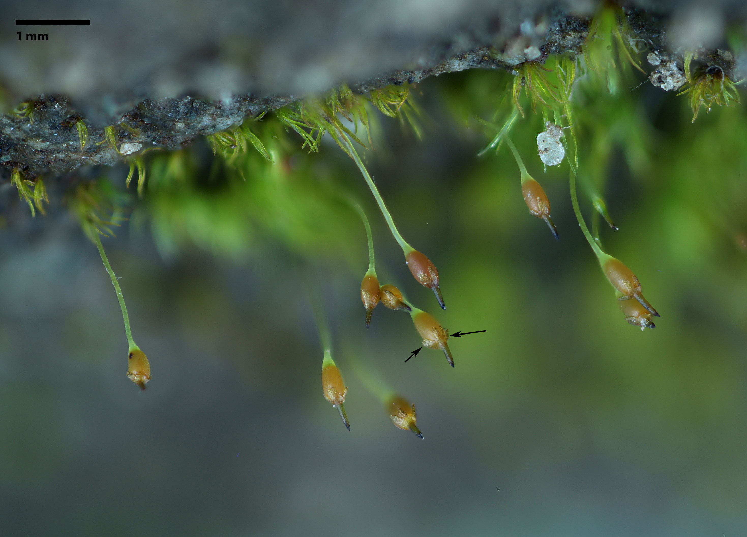 The arrows indicate the mitrate calyptra whose base is divided into several short lobes.