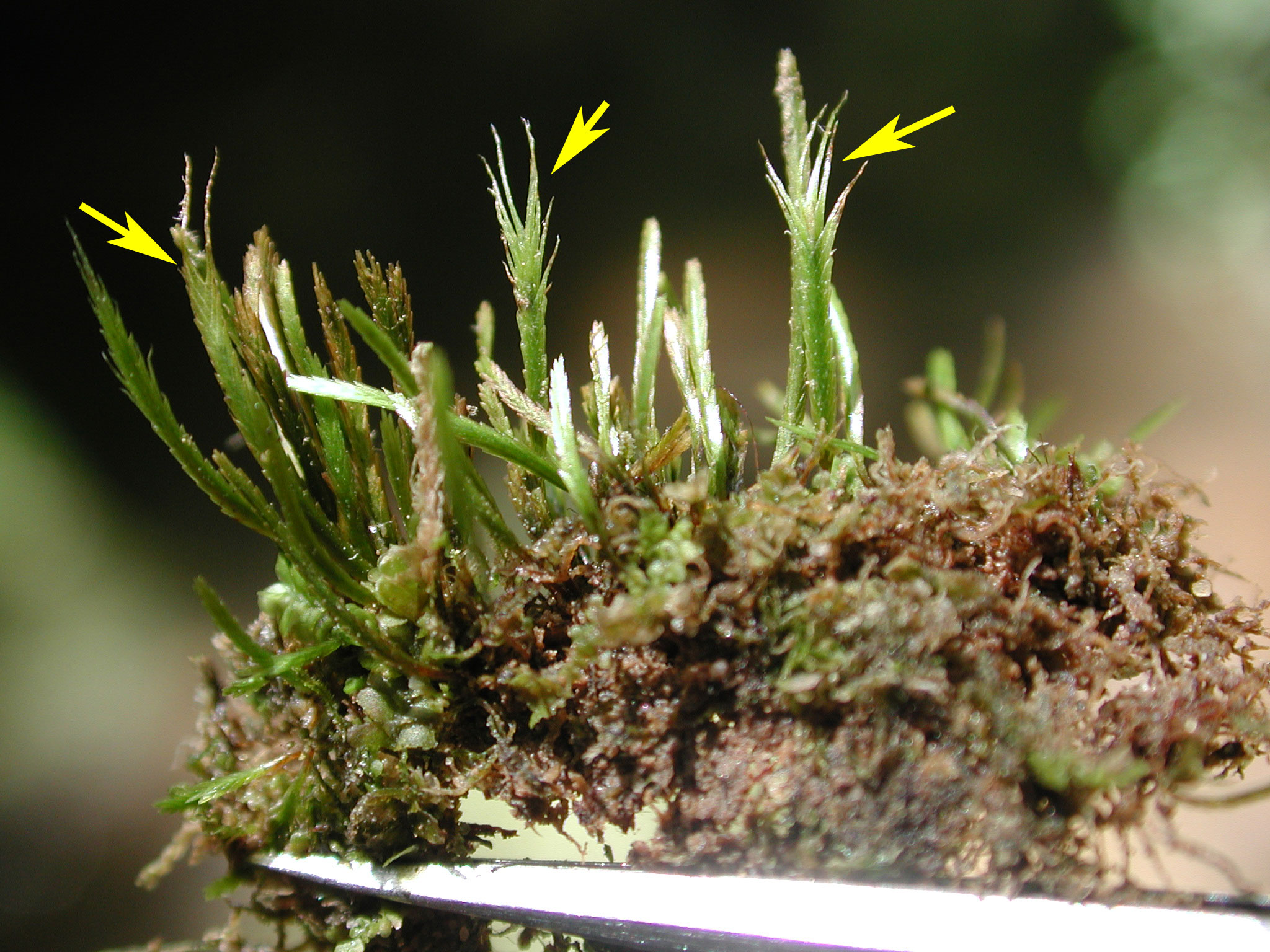 The arrows indicate female shoots with long perichaetial leaves at the shoot tips.