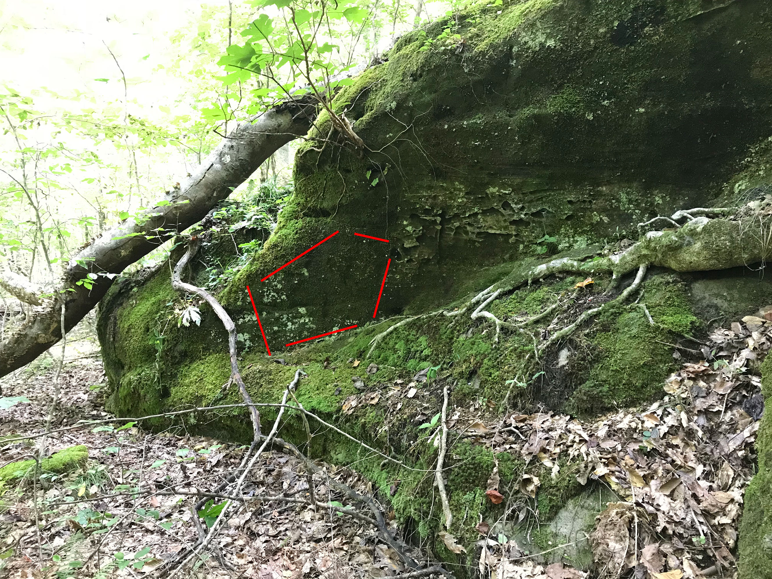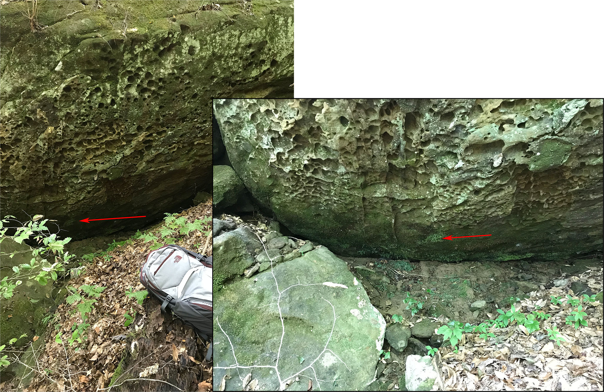 A somewhat exposed Alabama sandstone rock shelter about 50 ft from a stream. The next photo is a partial closeup.