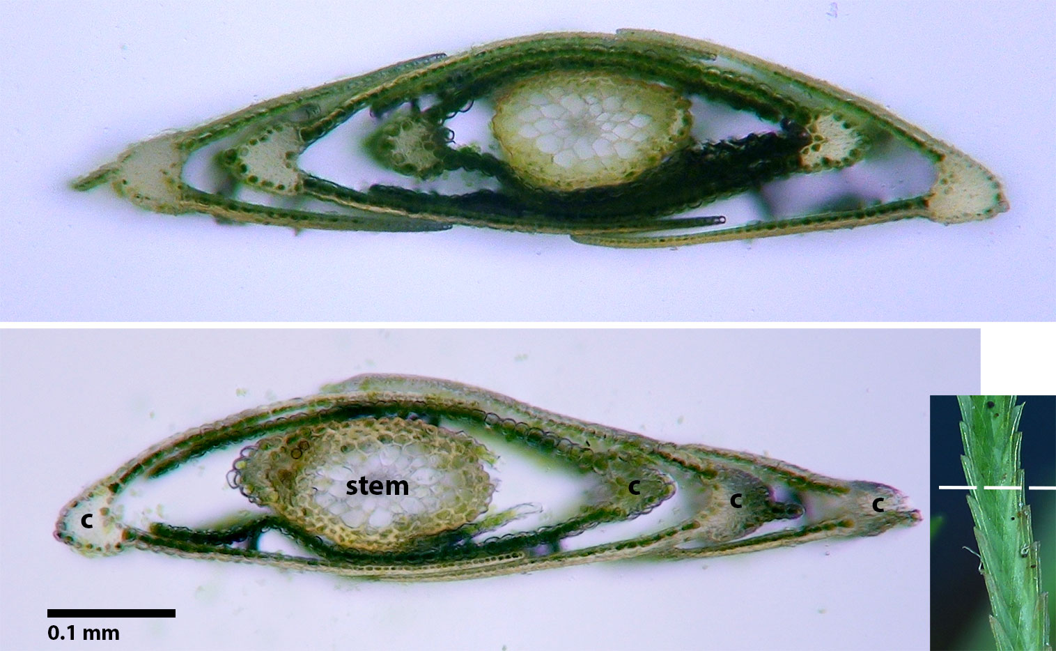 Cross-sections across an entire shoot showing how the leaves are folded and imbricate; the leaves are stacked together like taco shells; the stem and the costa (c) of individual leaves are labeled in the lower image.