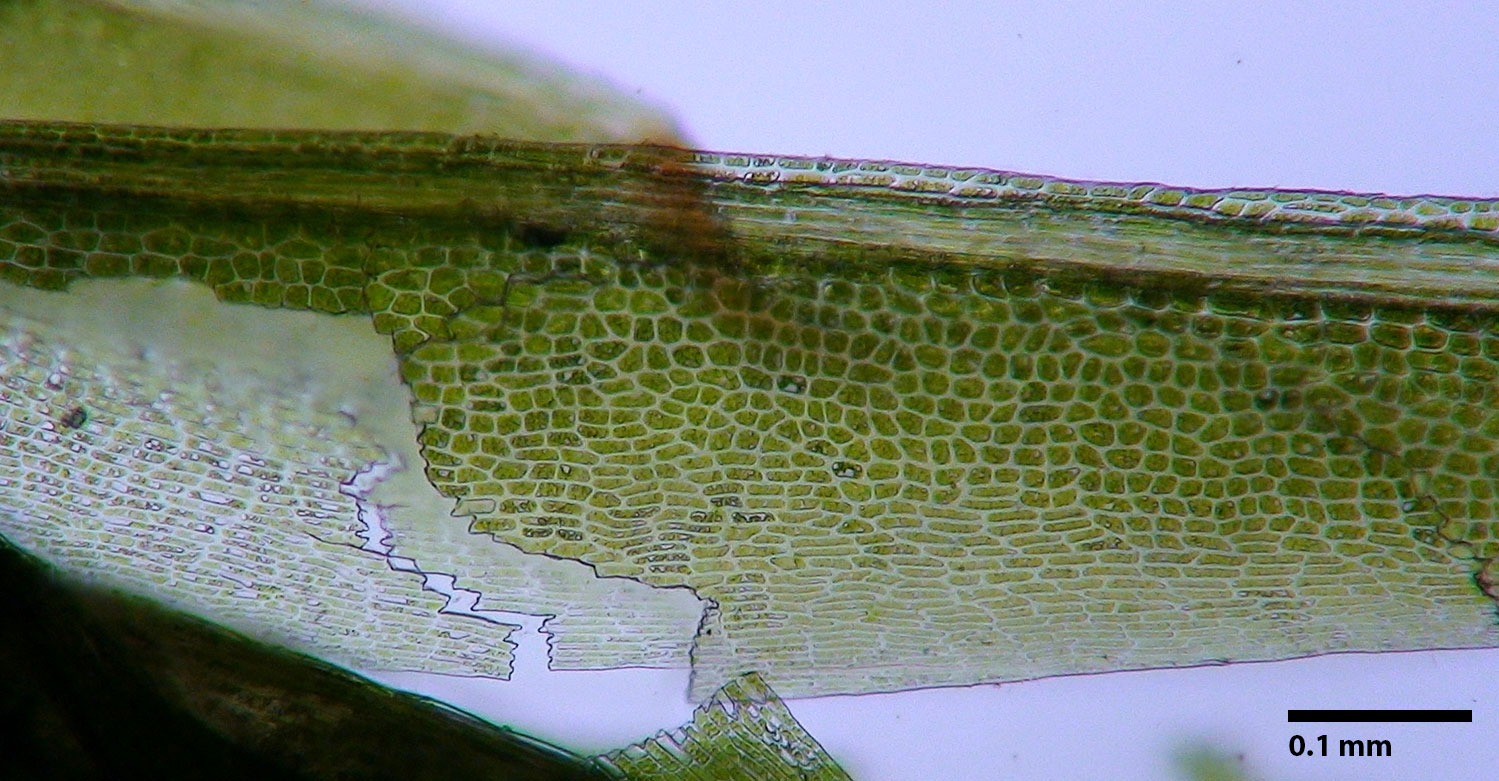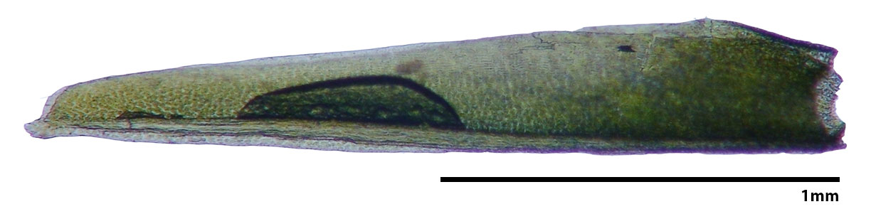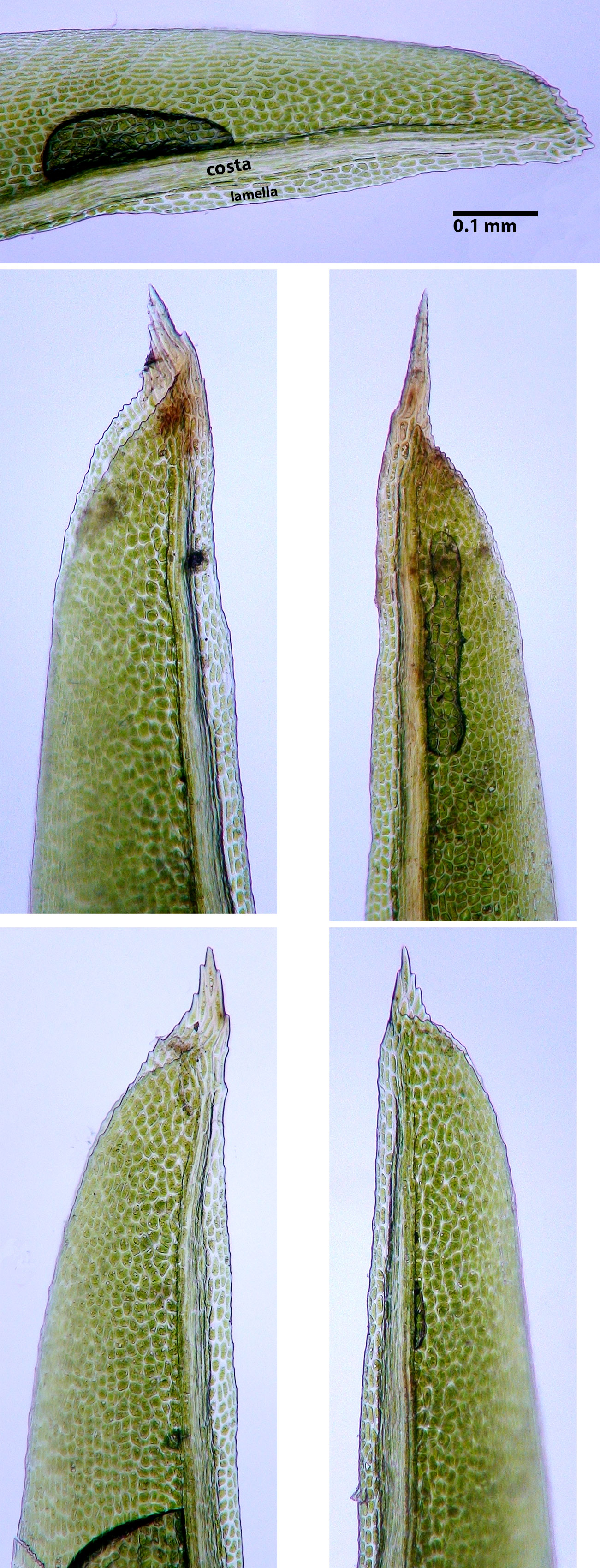 Tips of several leaves showing the costa and the lamella that projects from it, see labels in the upper image.