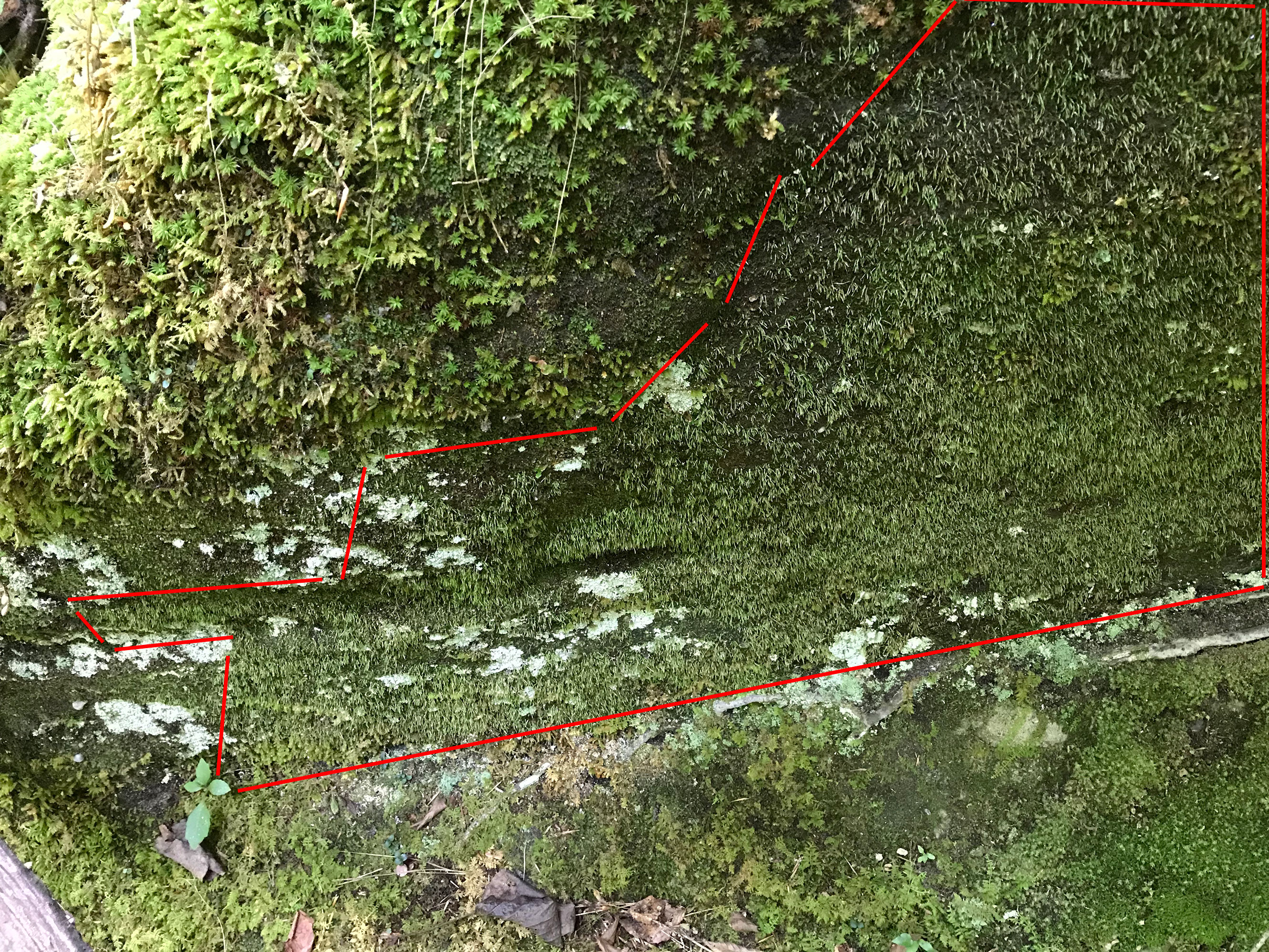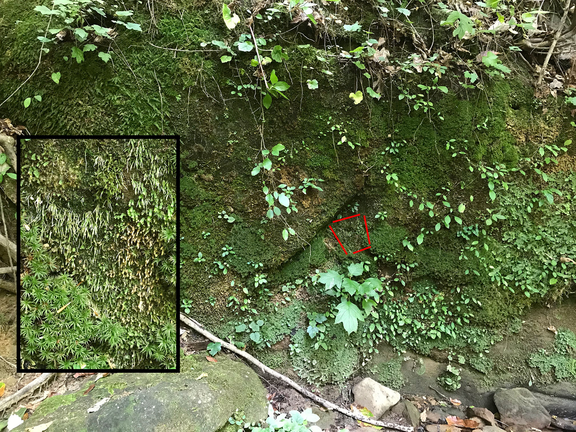 A small patch on a vertical rock face that forms the creek bank; with Pellia appalachiana along the base of the rock.
