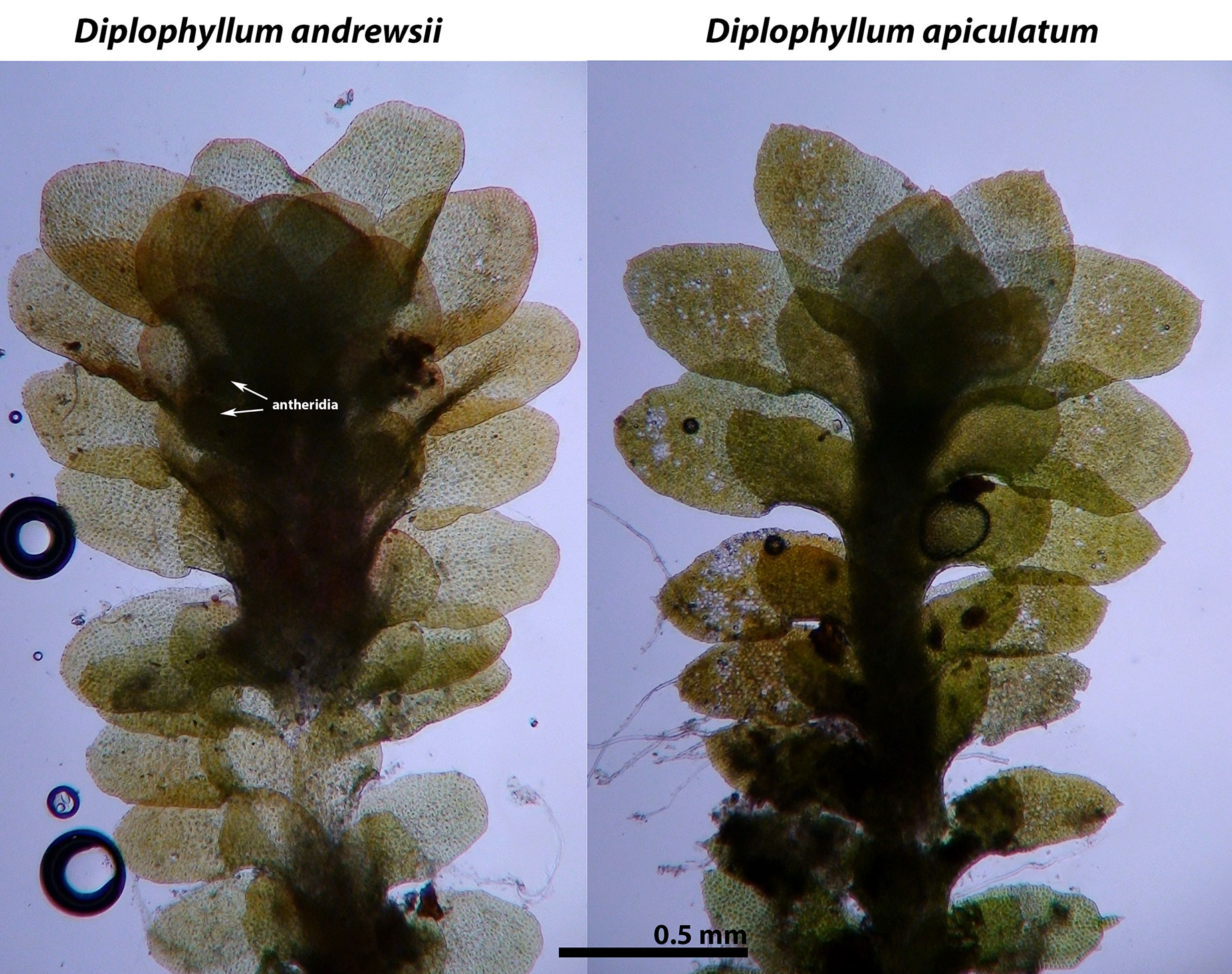 Diplophyllum andrewsii differs from all other regional species of Diplophyllum in that the leaf margins are entire. D. apiculatum, D. obtusatum, and D. taxifolium leaf margins bear small teeth.