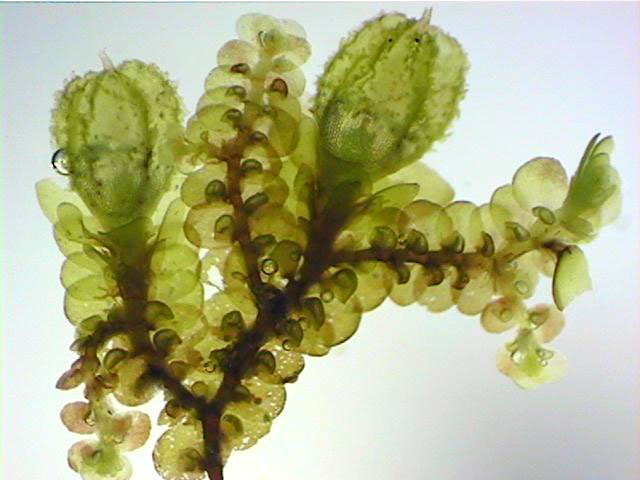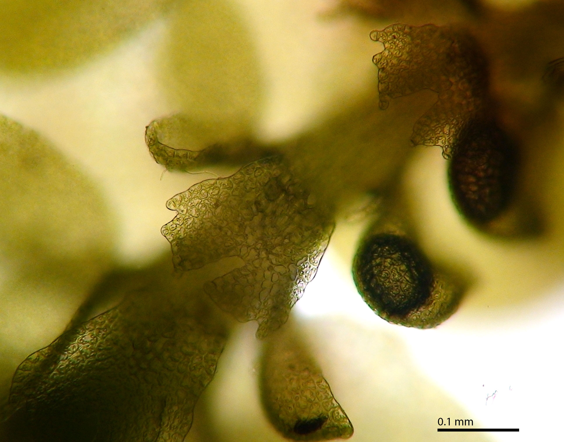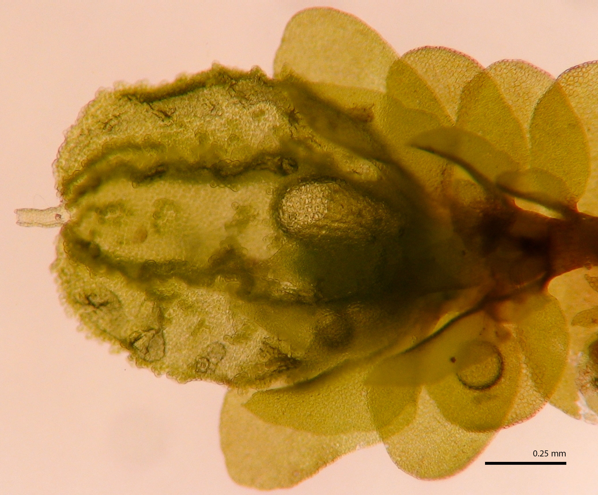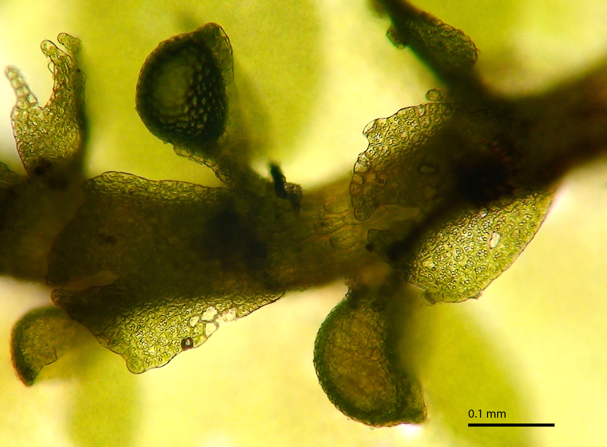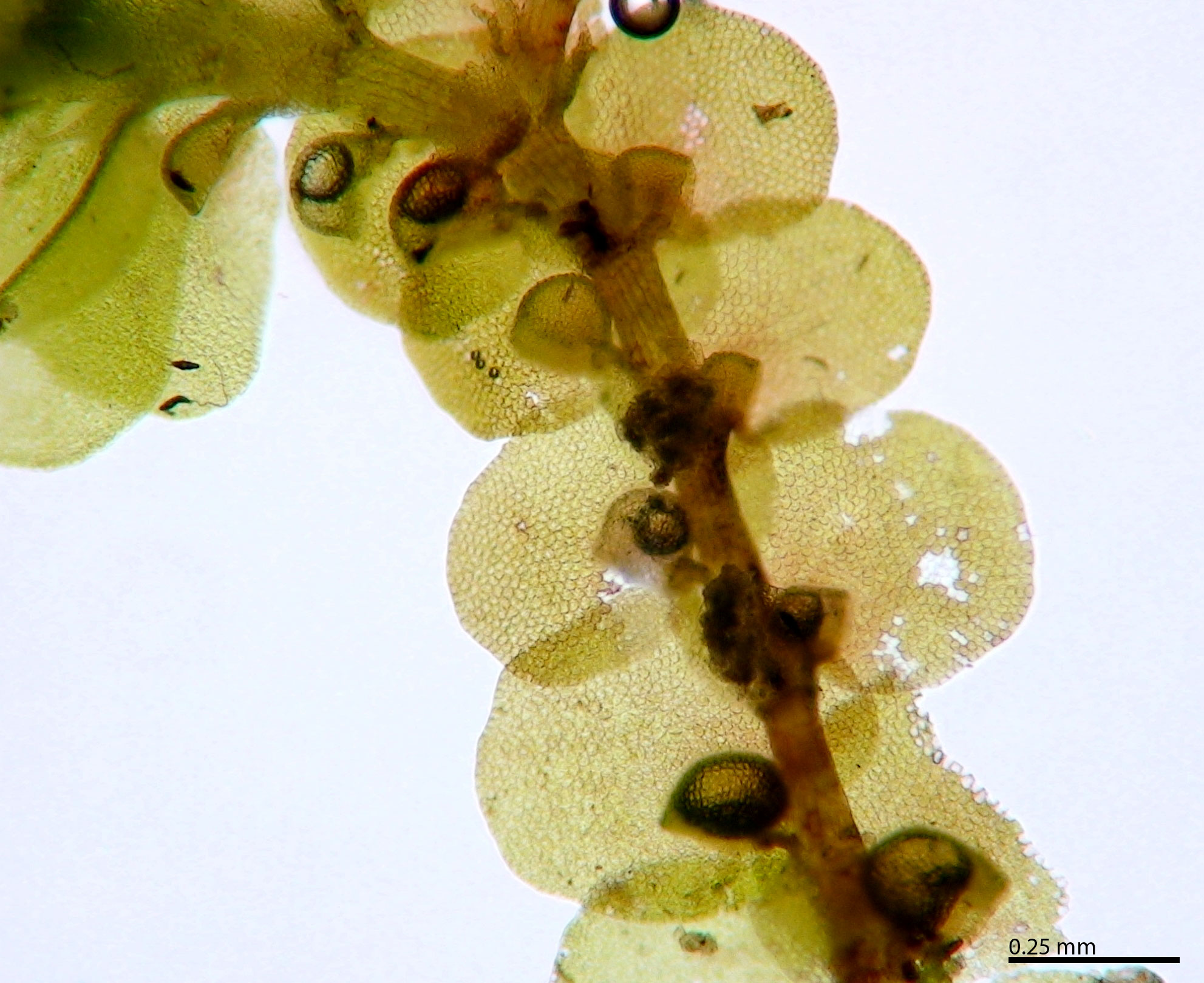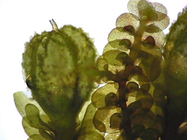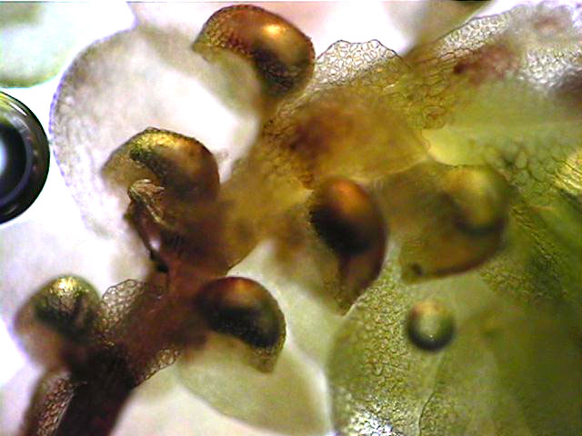 Well developed underleaves are very helpful in confirming identifications, especially in long-dead plants lacking oil bodies. The shape of underleaves is distinctive in the wide, toothed shoulders that quickly narrow to the insertion on the stem.