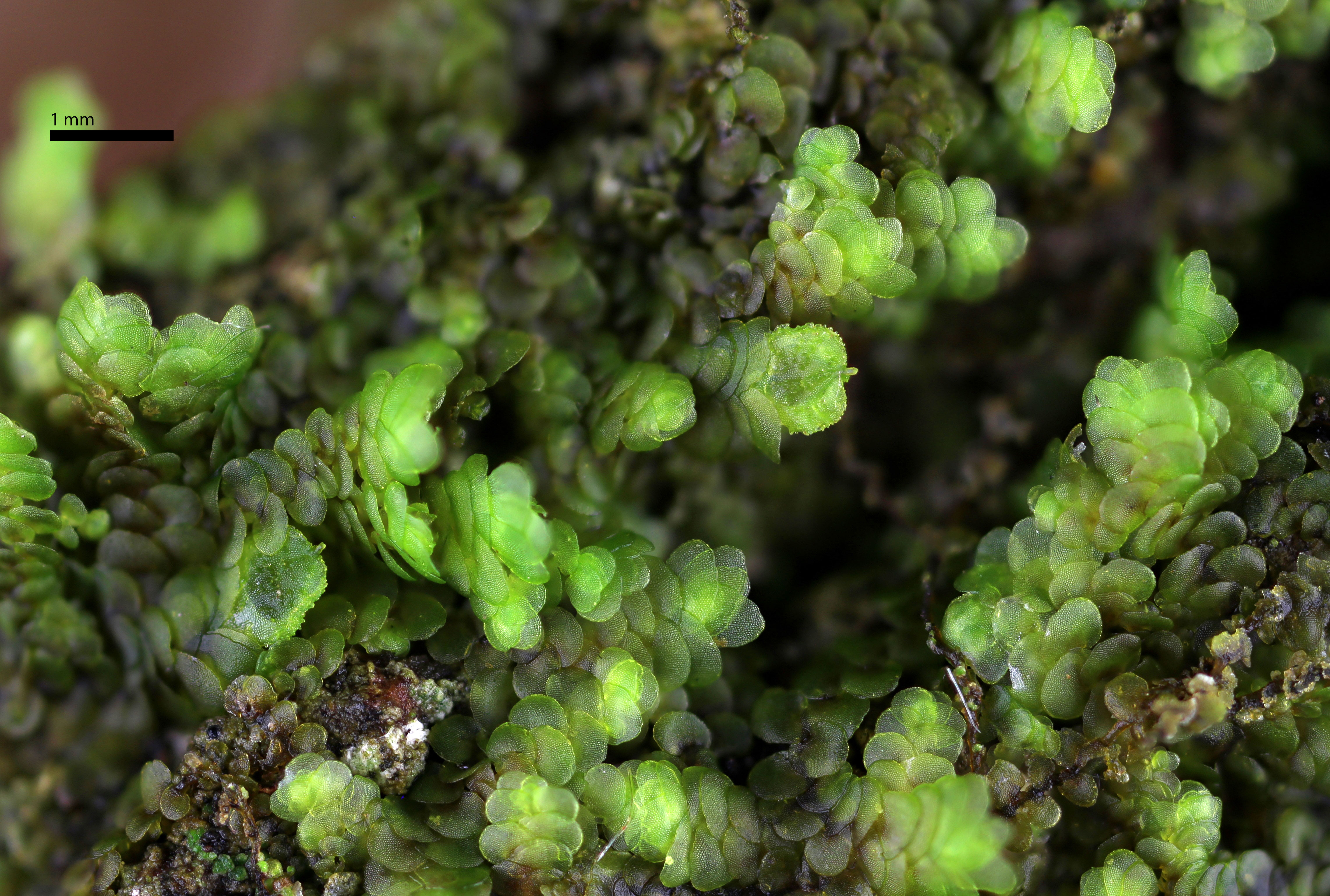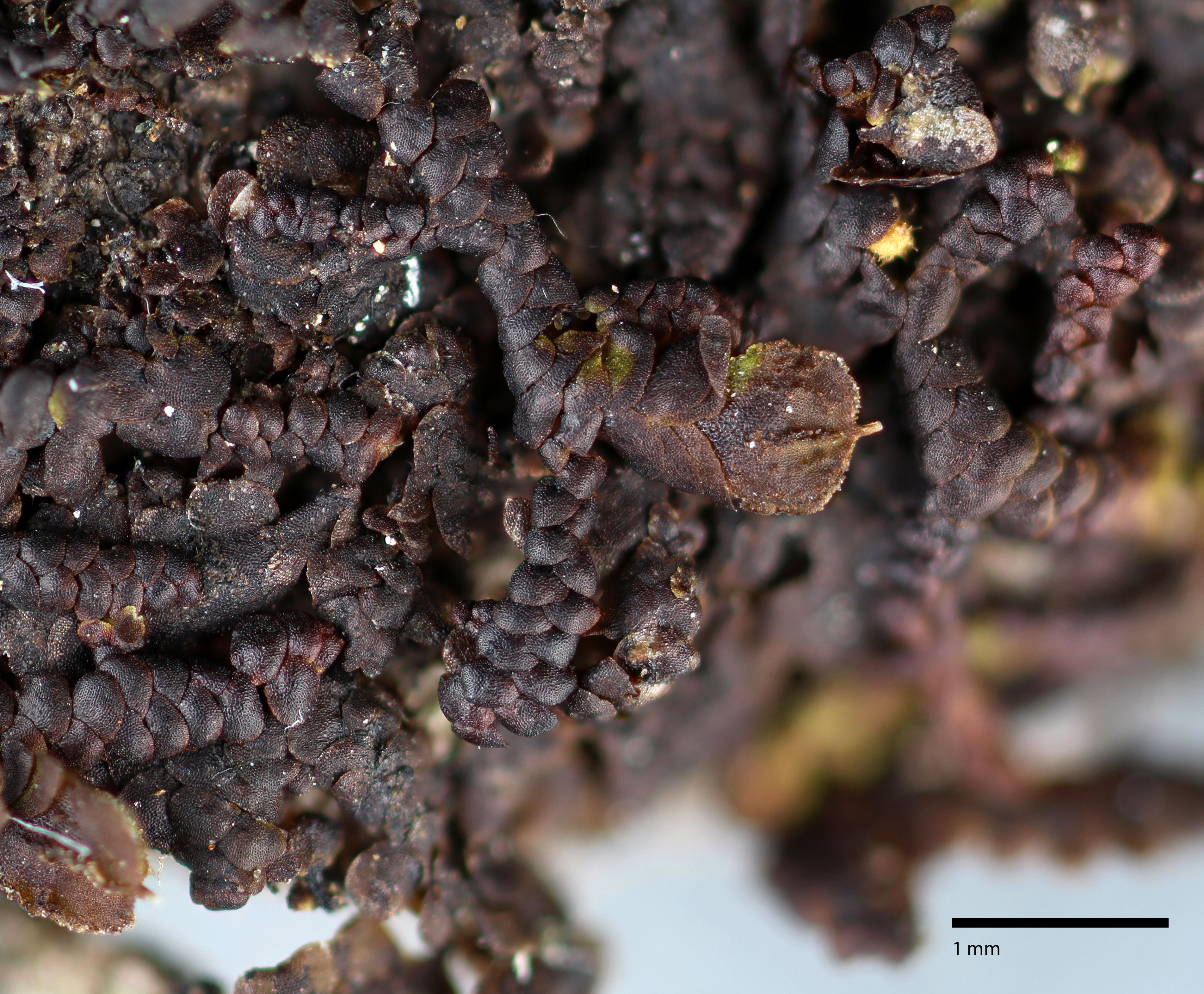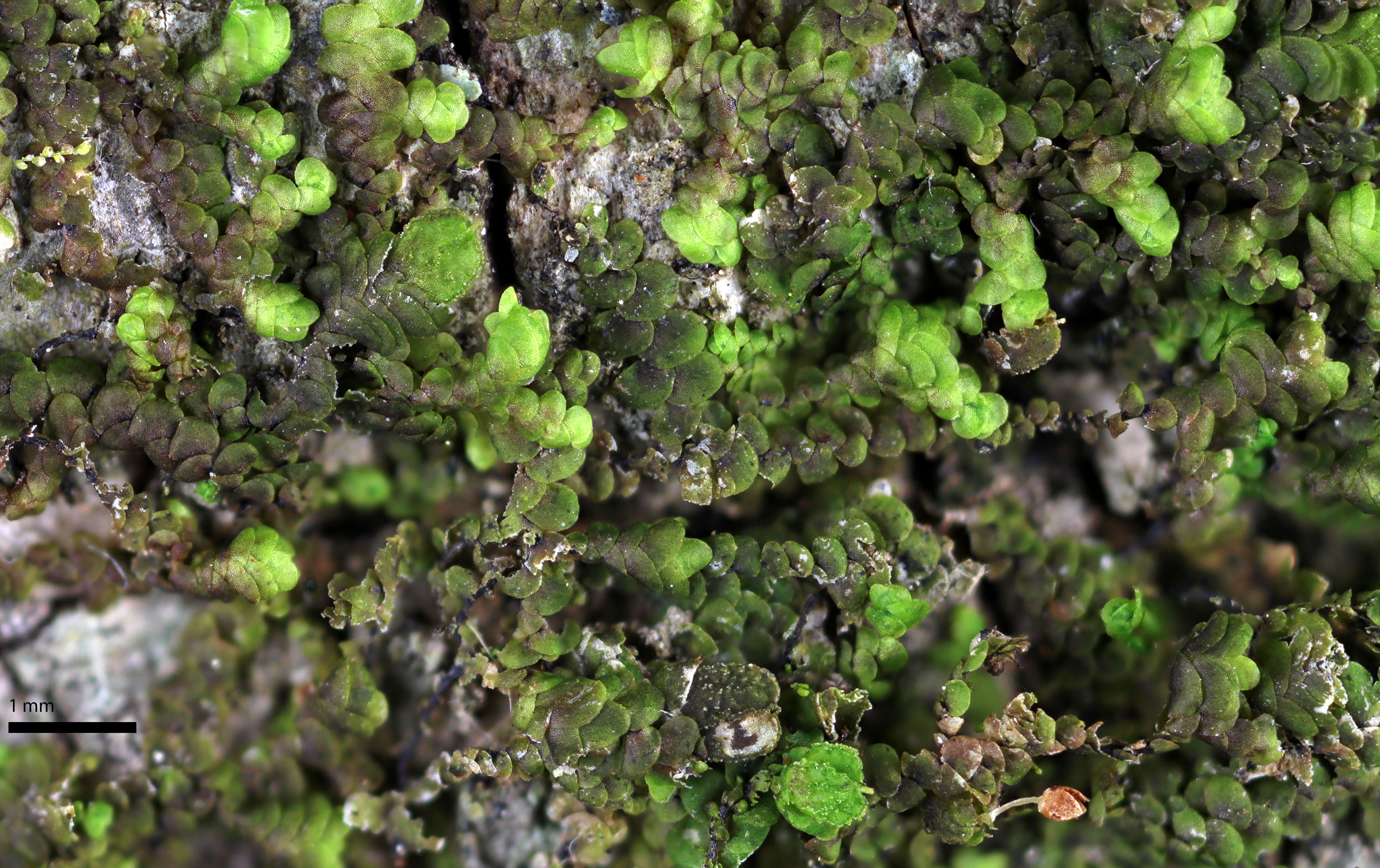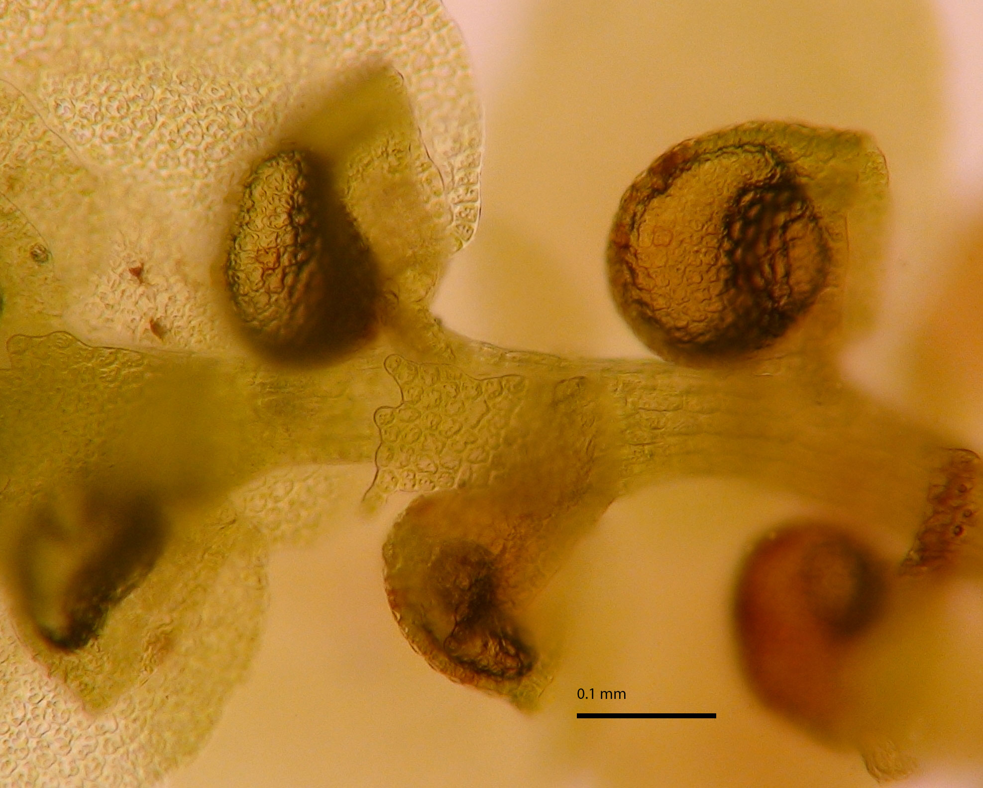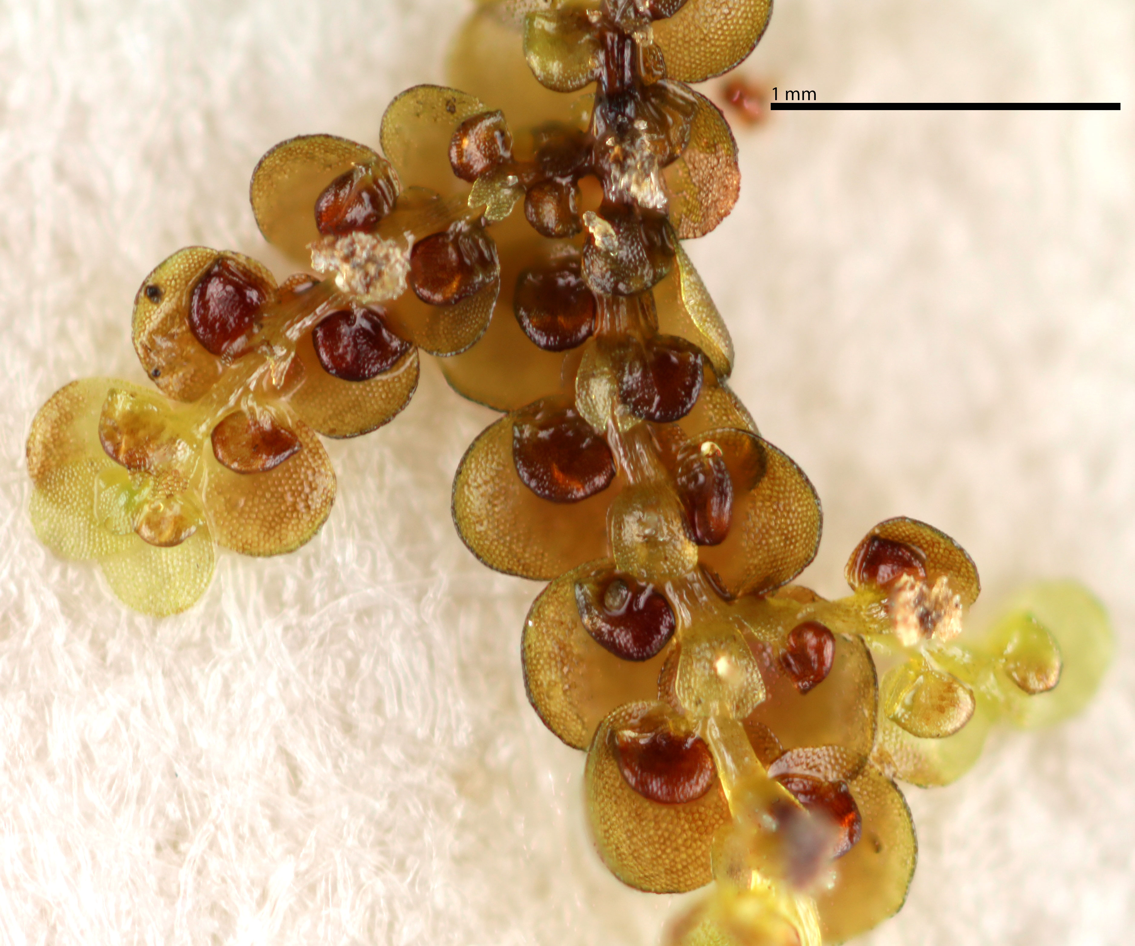 Well developed underleaves are very helpful in confirming identifications, especially in long-dead plants lacking oil bodies. The shape of underleaves is distinctive in the wide, toothed shoulders that quickly narrow to the insertion on the stem.