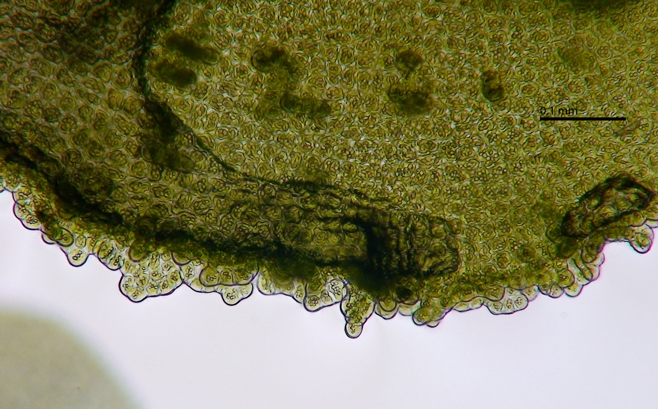 A portion of an underleaf in focus; leaf lobules compressed at mouth
