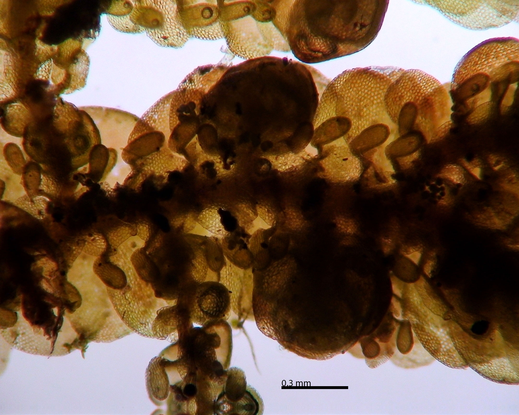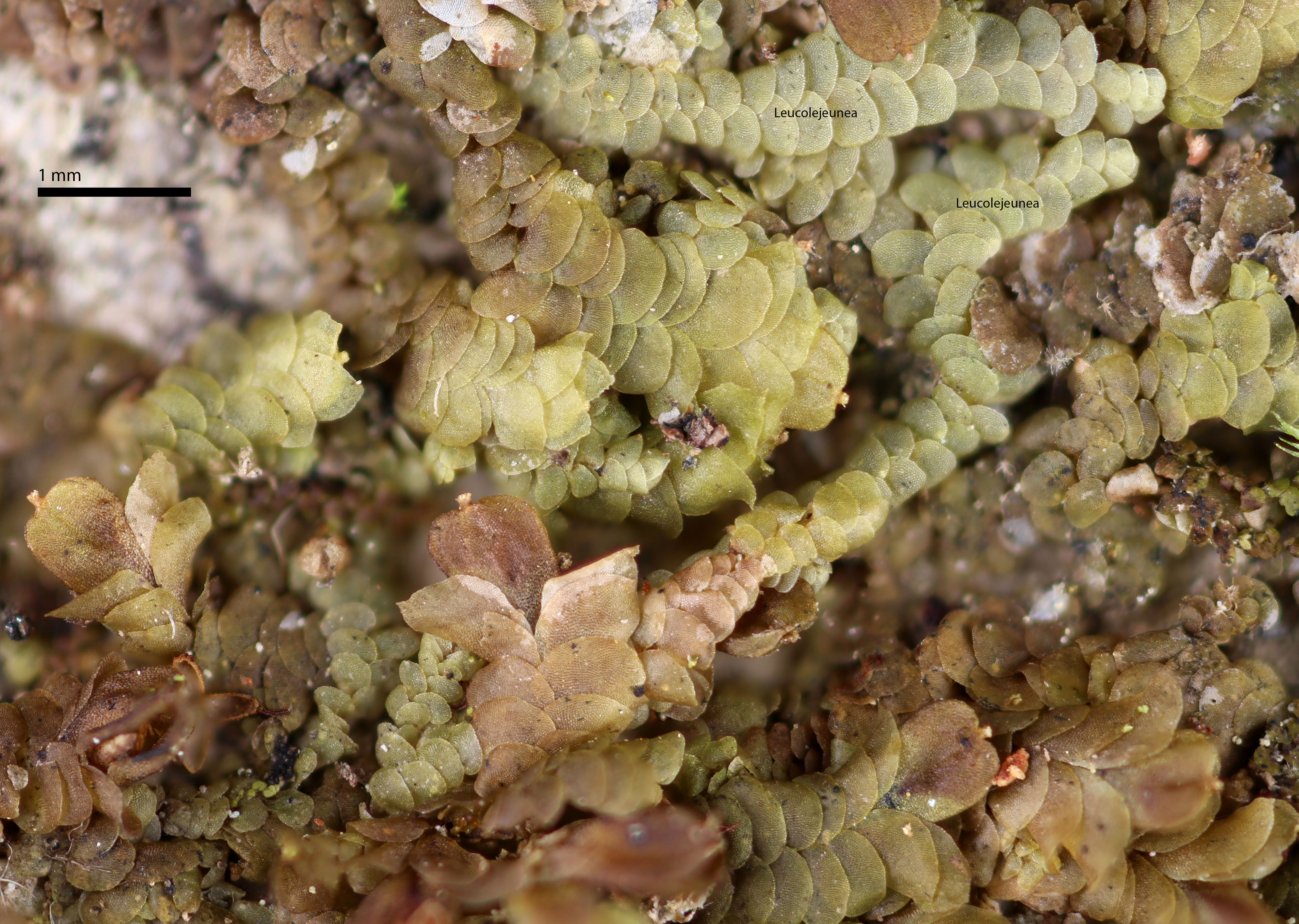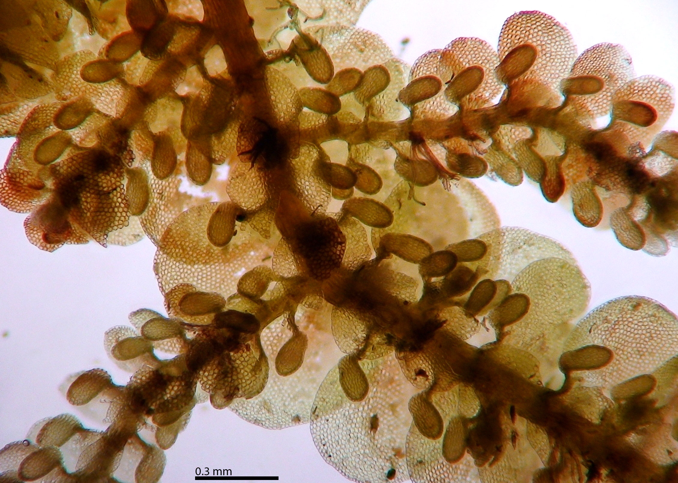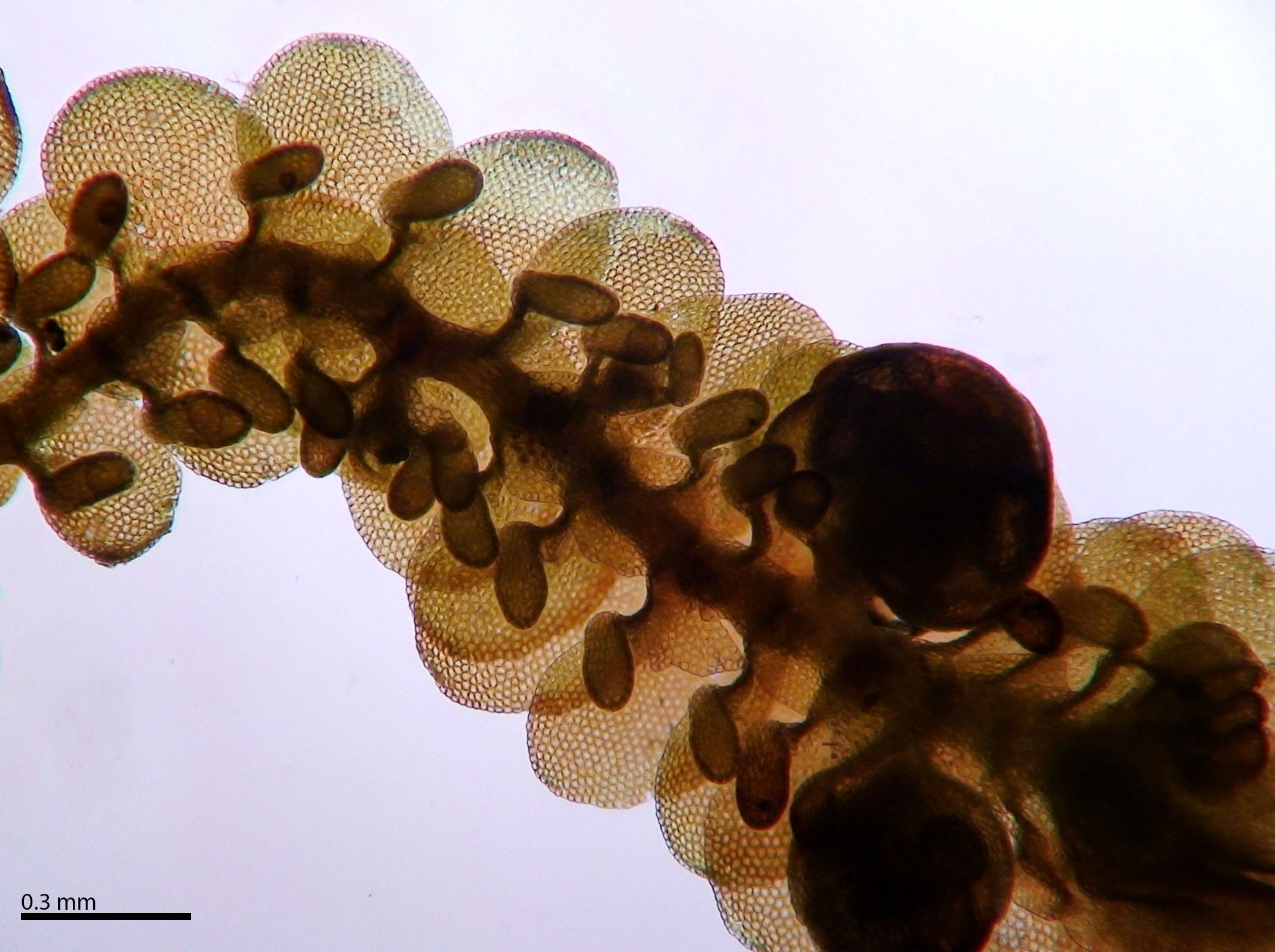 Dried plants with Leucolejeunea admixed. Note the perianths at the ends of main shoots. Perianths remain horizontal to the substrate more so than in other regional species of Frullania.