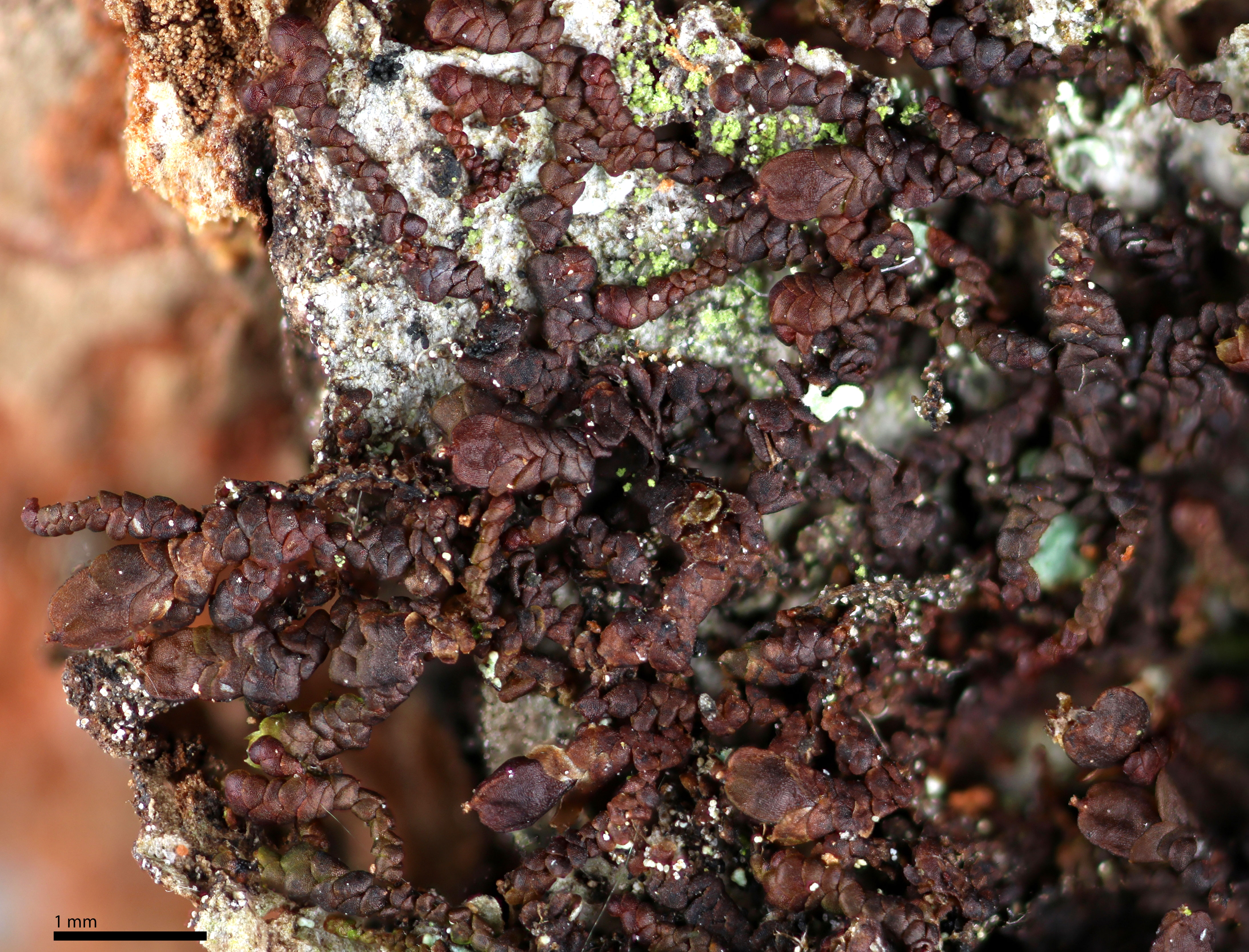 Shoot width: <1 mm.  Color: reddish to nearly black.  Cell walls in leaf lobe: without intermediate thickenings.  Dorsal lobe insertion: slightly cordate.  Lobules: longer than wide.