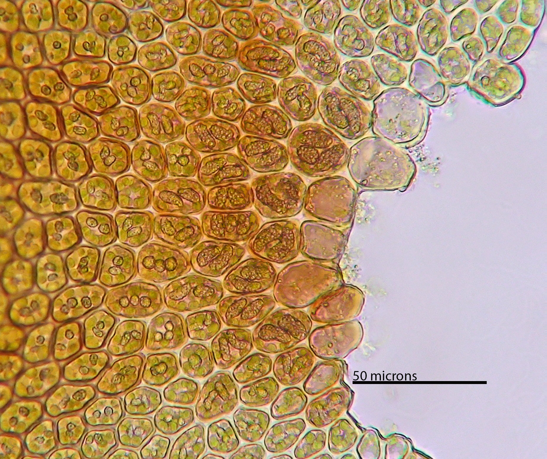 Cells at base of leaf lobe are enlarged and contain two large oil bodies, occasionally three.