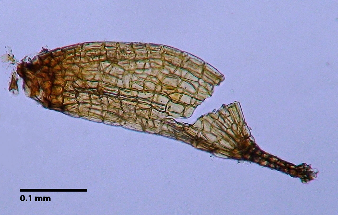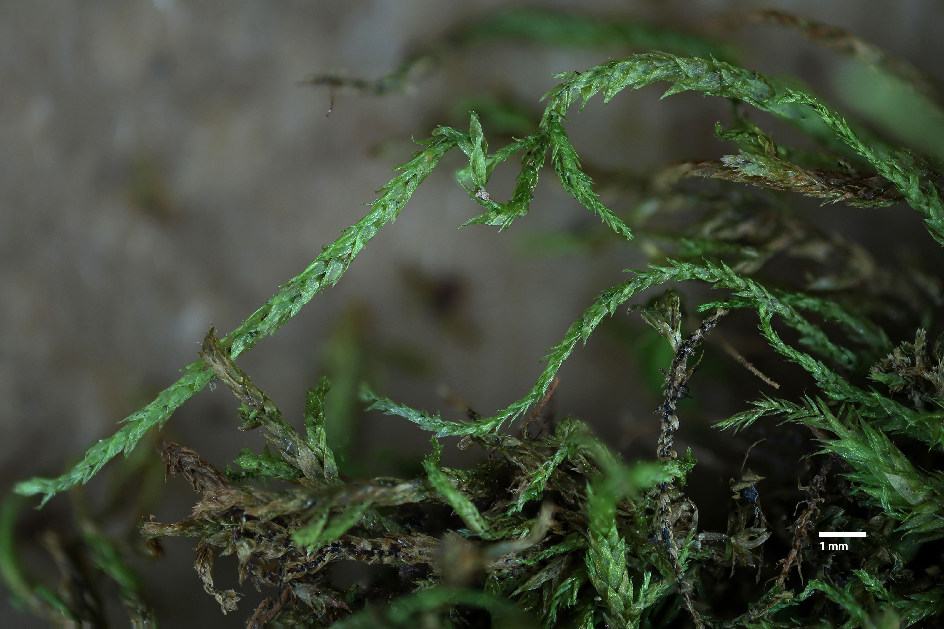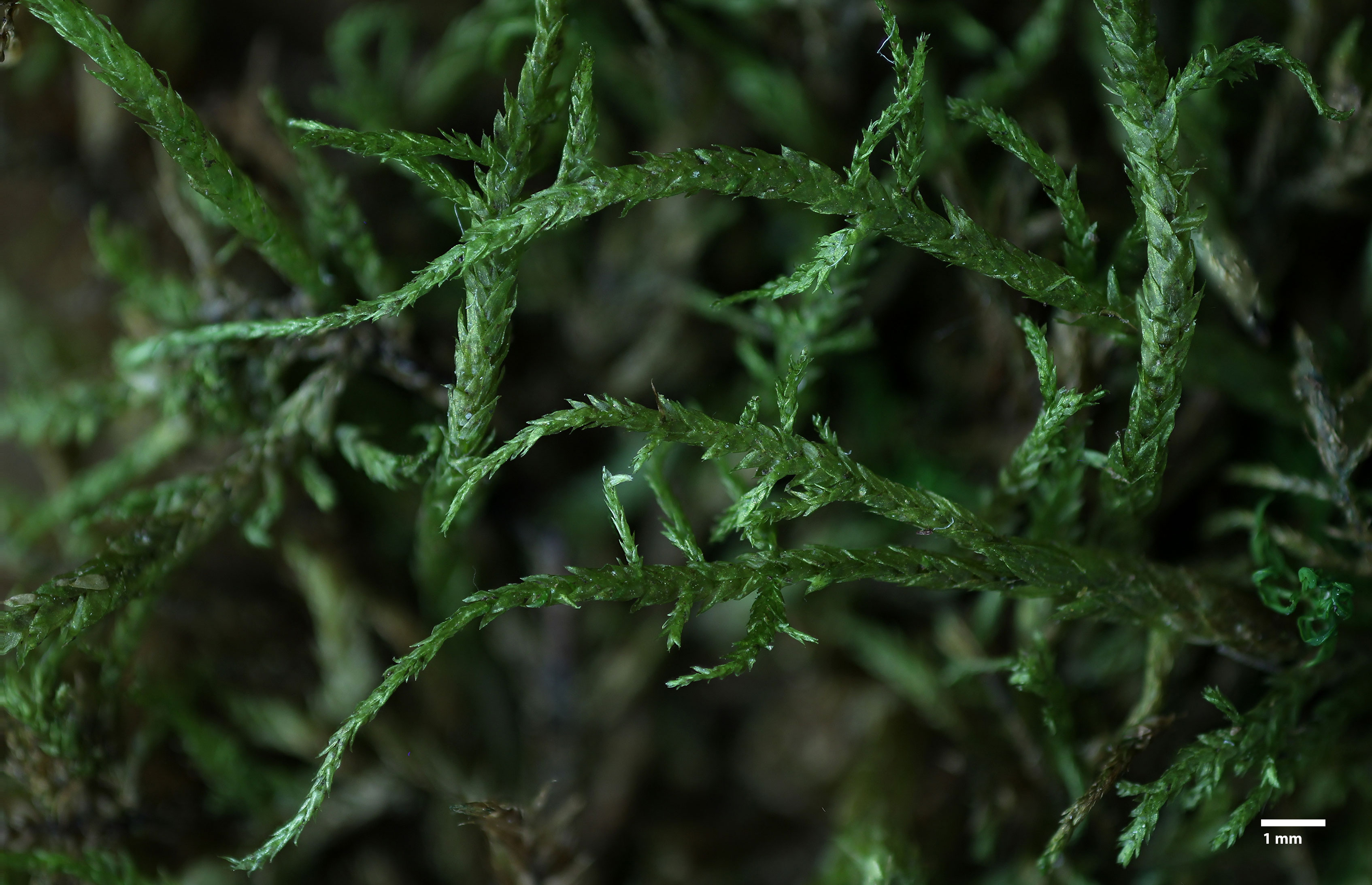 "Small, slender plants in flat, shiny, bright-green, yellow-green, or yellow-brown mats, creeping, freely and irregularly branched, scarcely recognizable in the field. Stems creeping or curved-ascending; branches straight, horizontal, slender and often nearly filiform; pseudoparaphyllia and brood branches none. Stem leaves erect, not particularly crowded, 0.5-1.0 mm long, moderately concave, oblong-ovate or oblong-lanceolate, sharply or bluntly acute; costae often 1/4 - 1/2 the leaf length; cells oblong-linear, somewhat flexuose, not thick-walled, finely prorulose at back; subquadrate alar cells few and inconspicuous. Branch leaves similar, small, 0.25-0.5 mm long. Inflorescences and sporophytes unknown." Quoted text from Anderson (1996). In addition, leaf margins are serrulate especially towards the leaf apex and narrowly recurved towards the leaf base; leaves are narrowly decurrent.