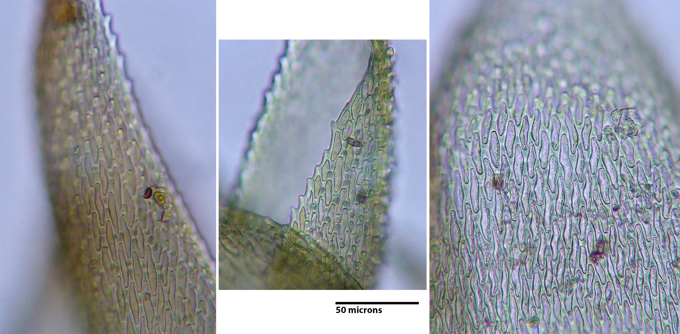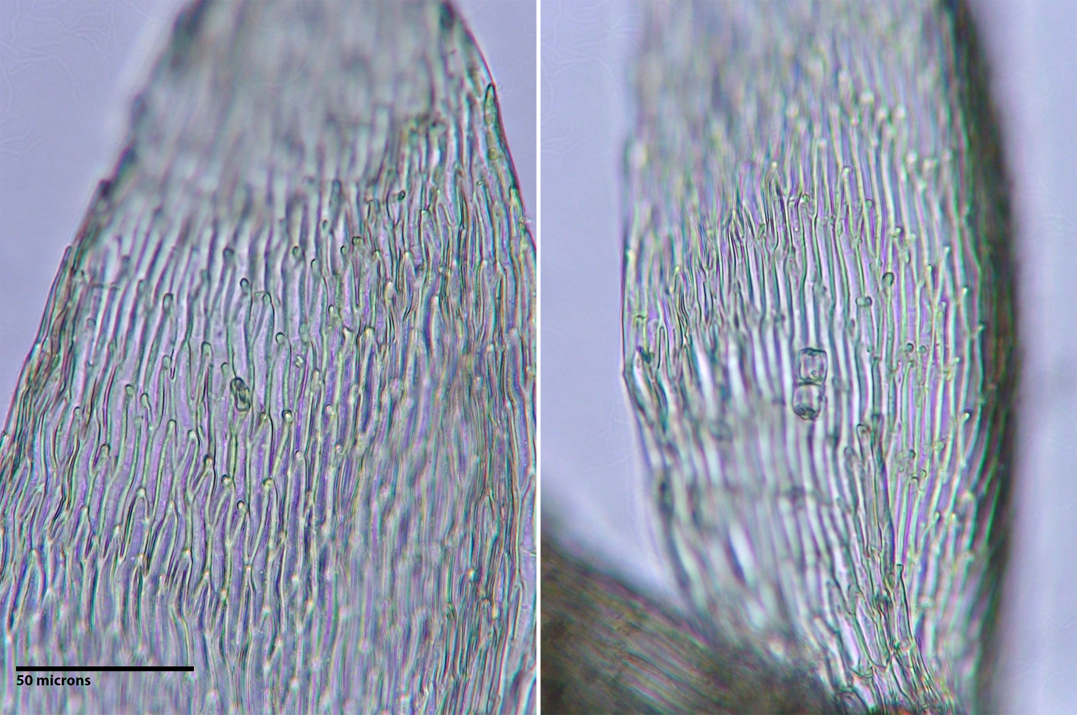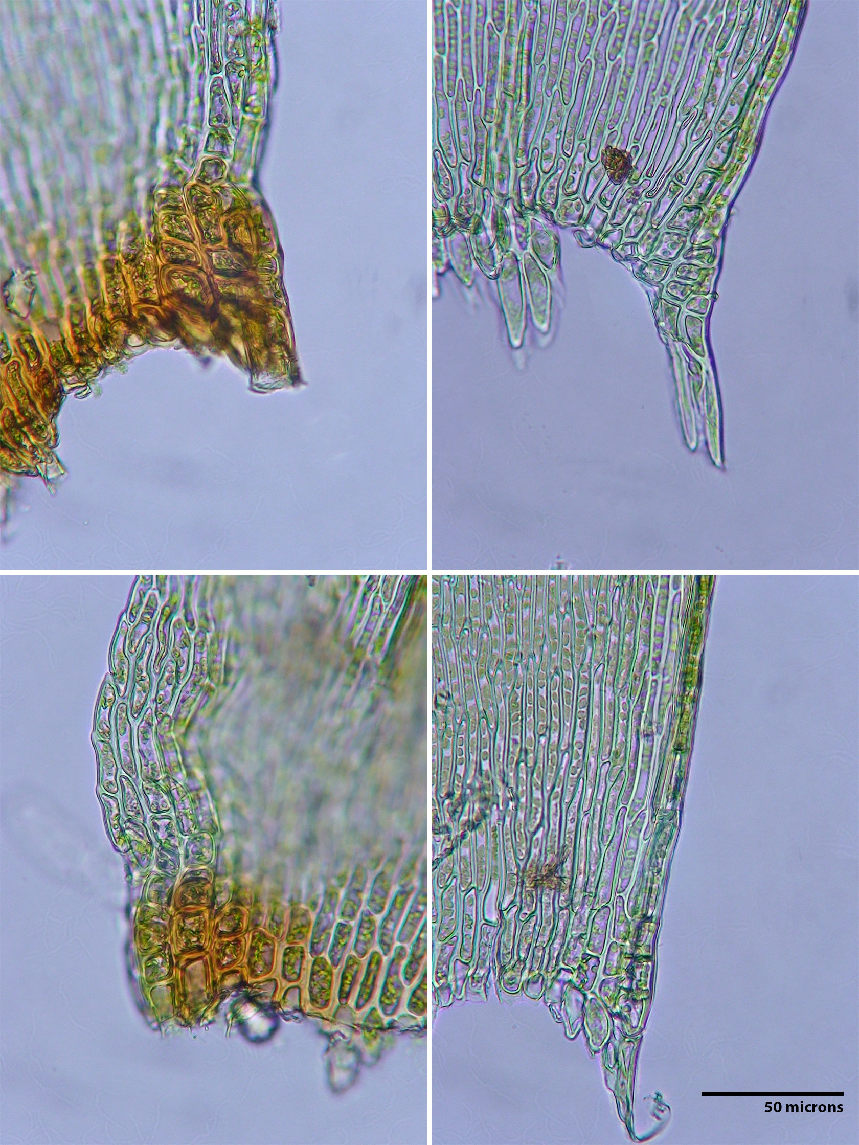 Leaf tips in the left column from larger leaves of robust stem sectors; right column from flagelliform sectors. In confirming the identification of this collection, Bill Buck (NY) commented (e-mail, October 2018), "Note the fairly prominent prorulose cells and how the leaf apex is often a pair of cells rather than just a single cell." Prorulose cells are shown in the next photograph.