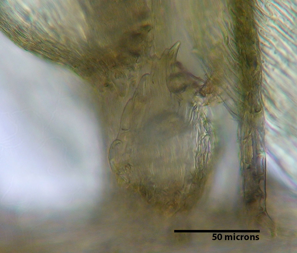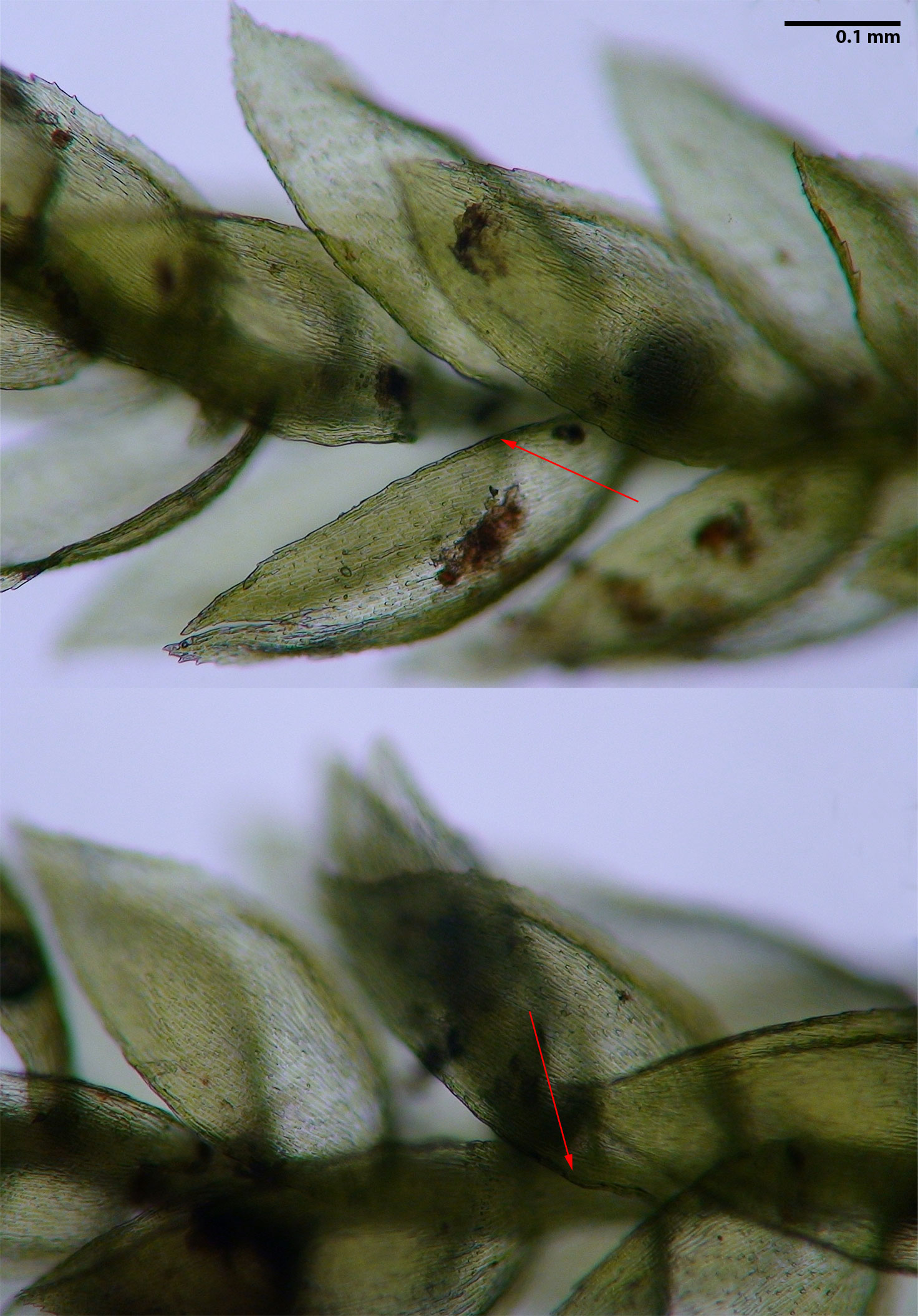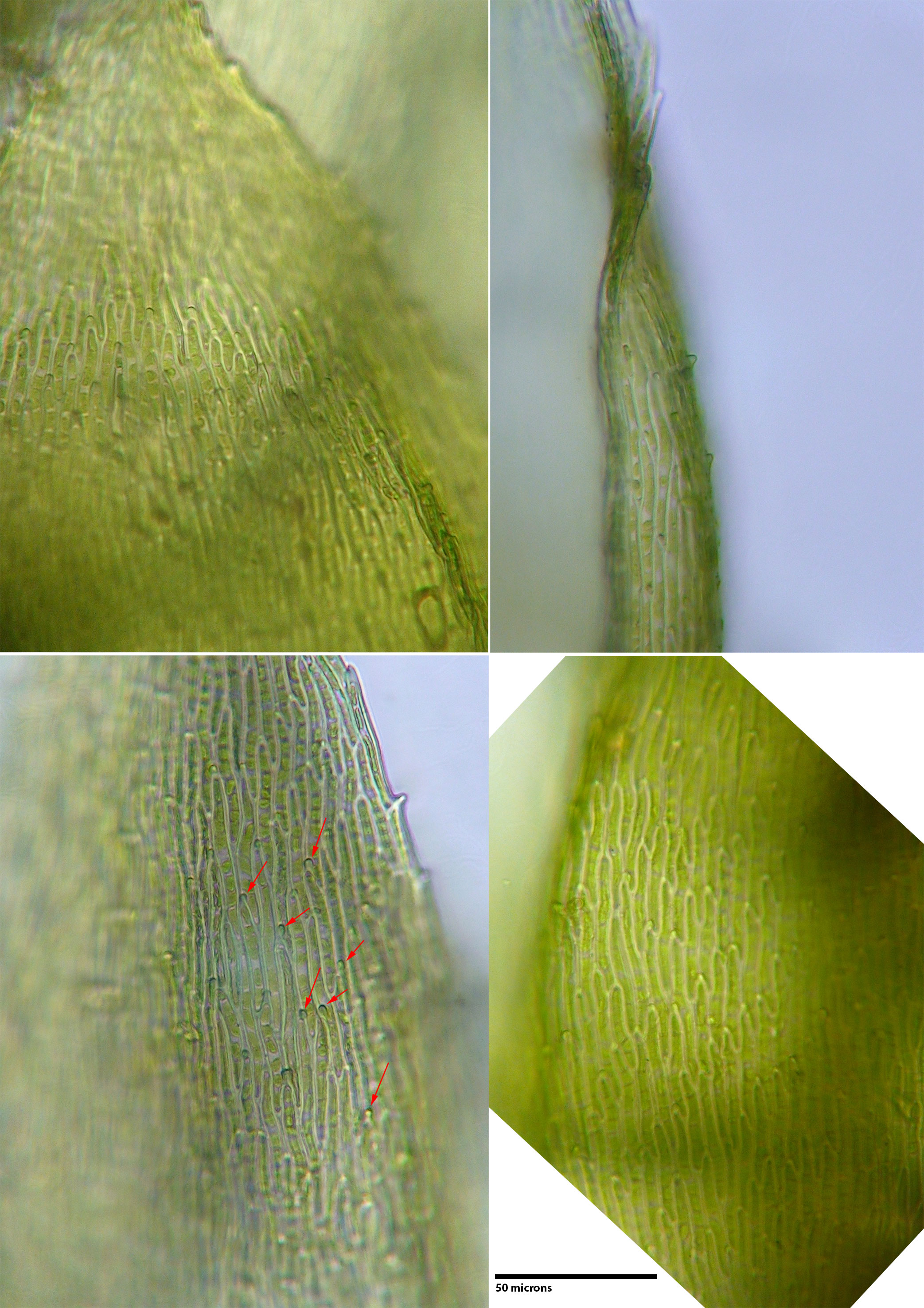 Leaf tips in the left column from larger leaves of robust stem sectors; right column from flagelliform sectors. In confirming the identification of this collection, Bill Buck (NY) commented (e-mail, October 2018), "Note the fairly prominent prorulose cells and how the leaf apex is often a pair of cells rather than just a single cell." Prorulose cells are shown in the next photograph.