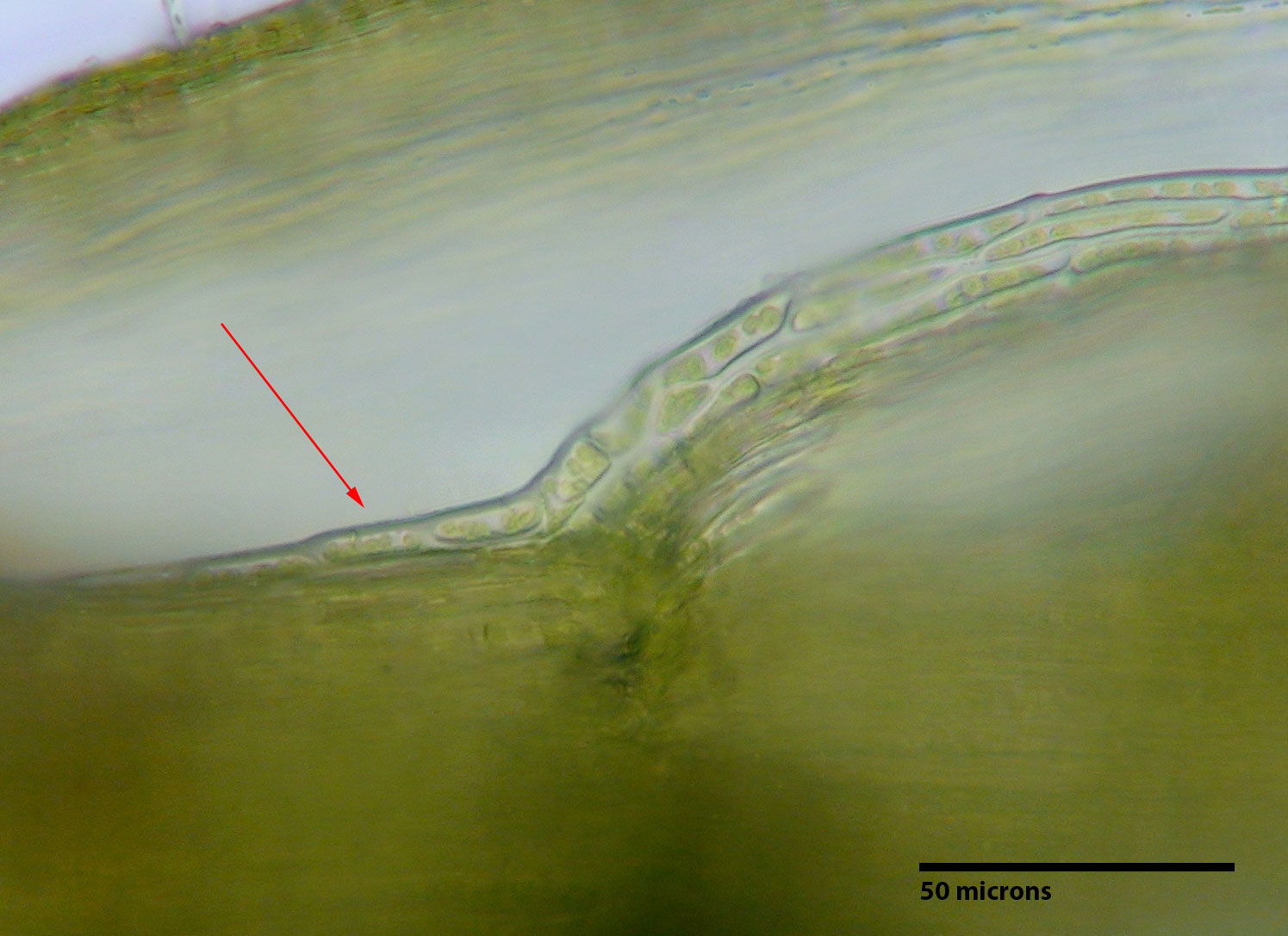 Several projecting end walls (papillae) are indicated in the lower left image. This type of papilla is technically called a prorula, and the term prorulose (prorulate) distinguish this type of papillosity from papillae that form over the cell lumen. The images above show the backside (abaxial surface) of leaves.