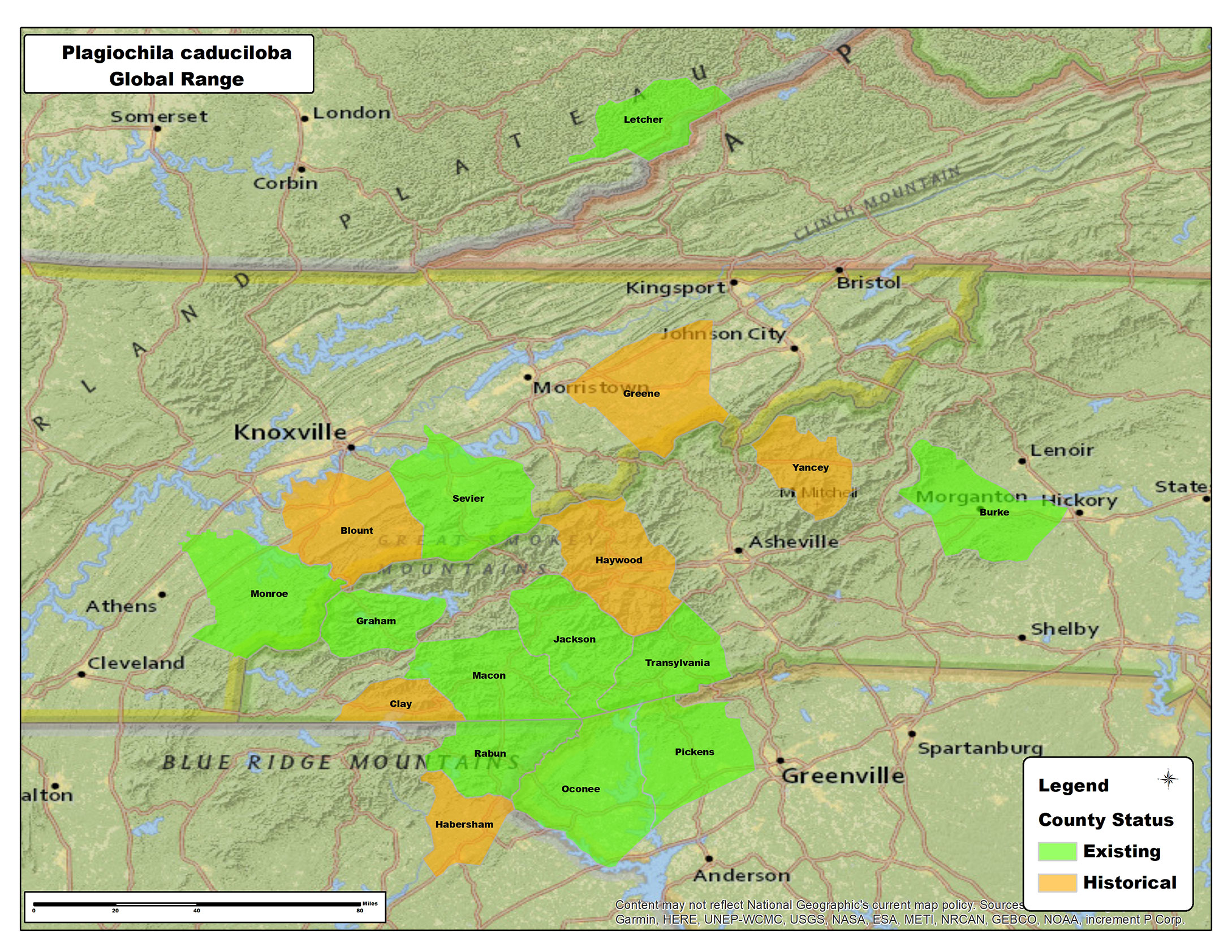 Endemic to southeastern U.S.A. Georgia, Kentucky, North Carolina, South Carolina, Tennessee. Retricted to the Blue Ridge of the southern Appalachians with an outlying population to the north in the Cumberland Mountain section of the Appalachian Plateaus province in Kentucky.