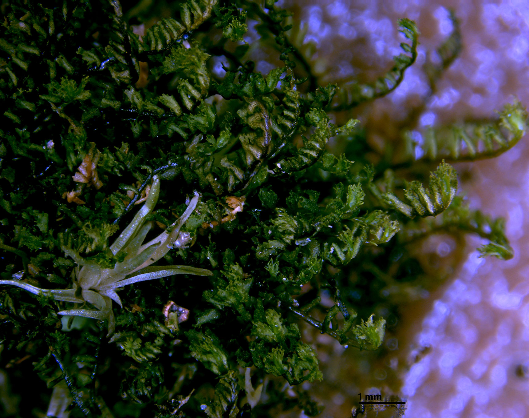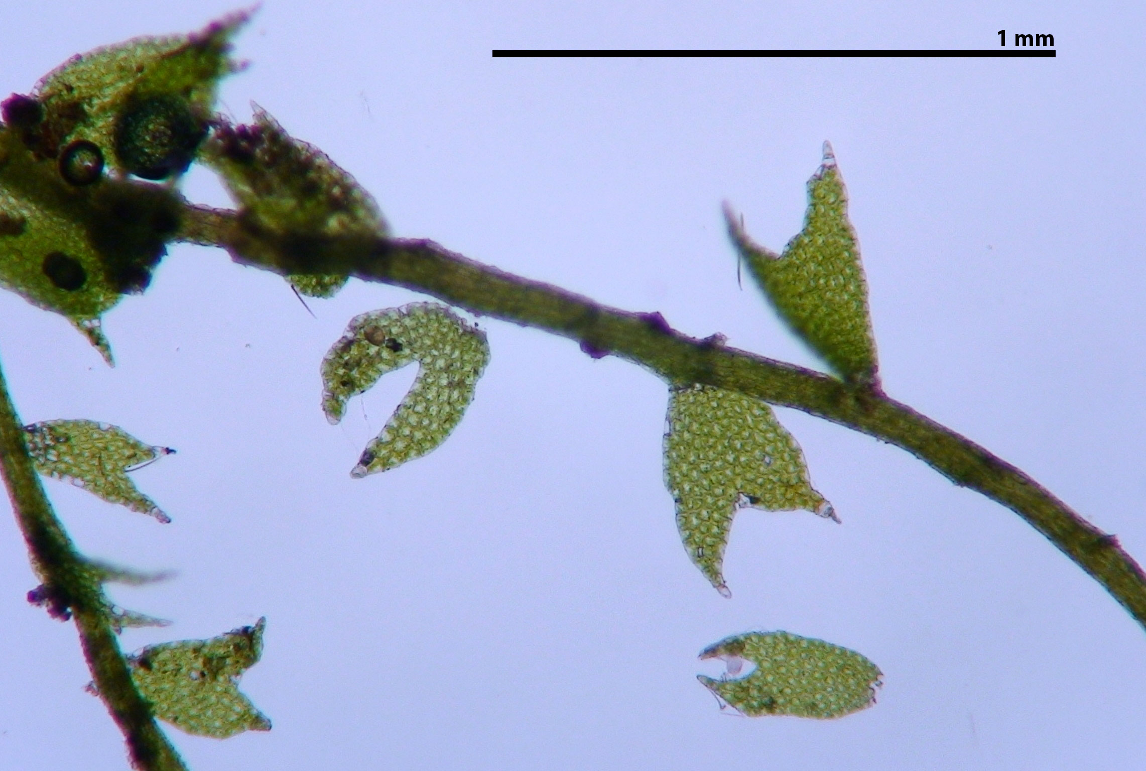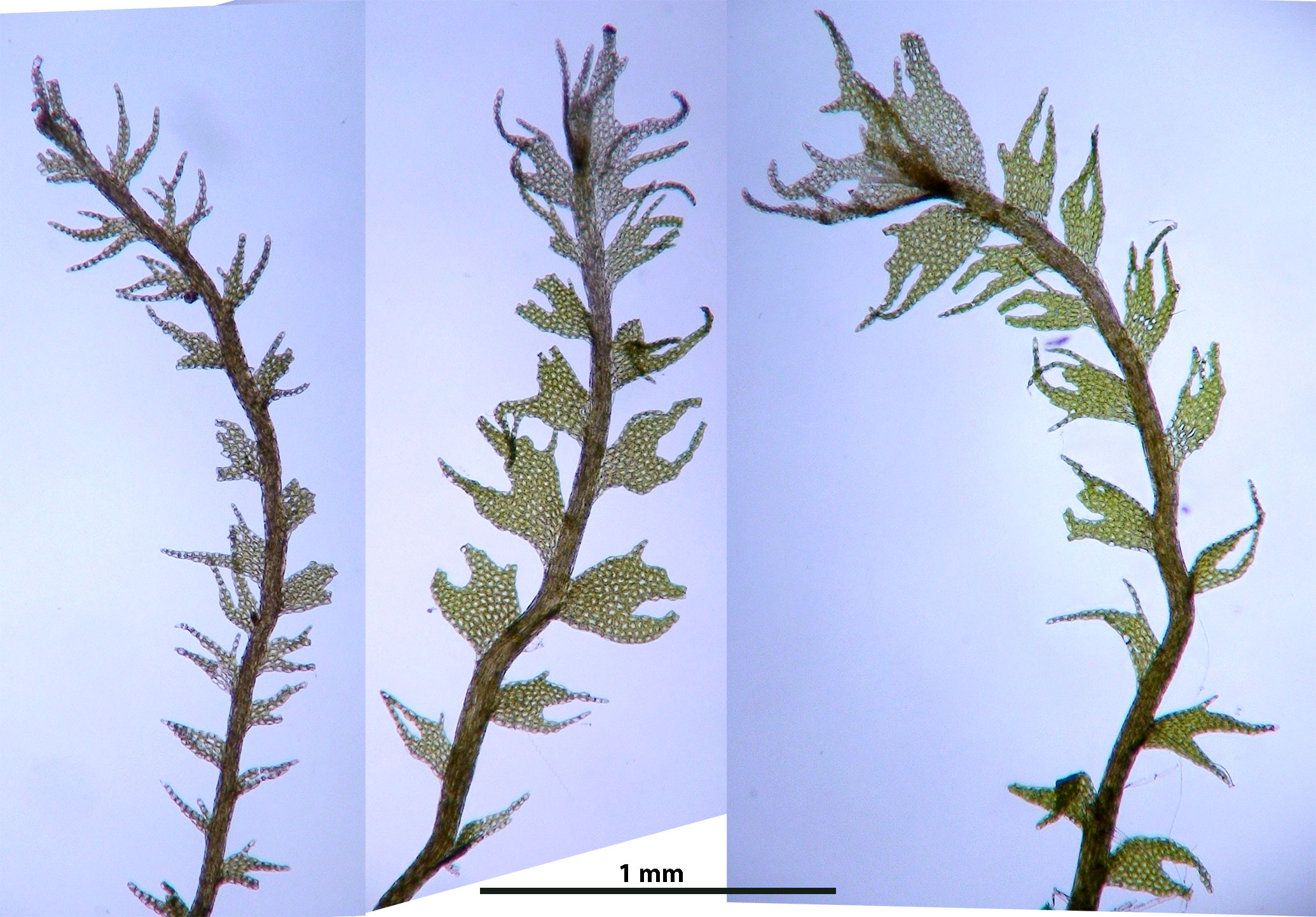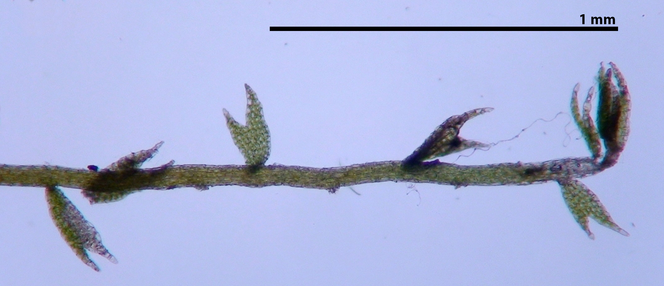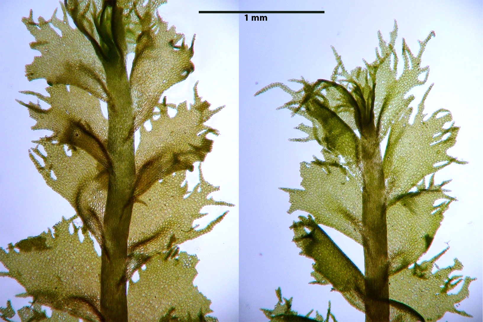 Dorsal view of two shoots. As in most liverworts, leaves occur in two rows, one on each side of the stem. A third row of reduced underleaves is present on the ventral side but the underleaves are composed of only a few cells and not likely to be seen except with special effort.