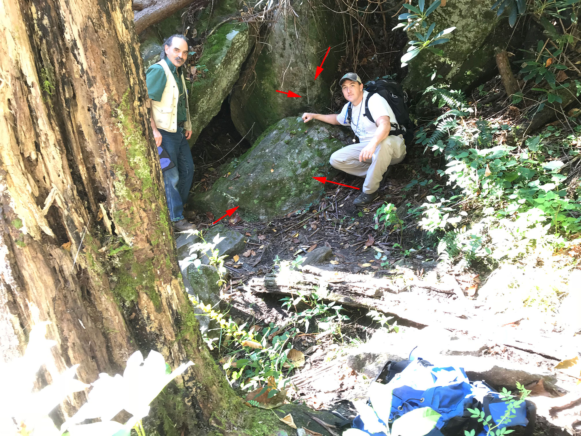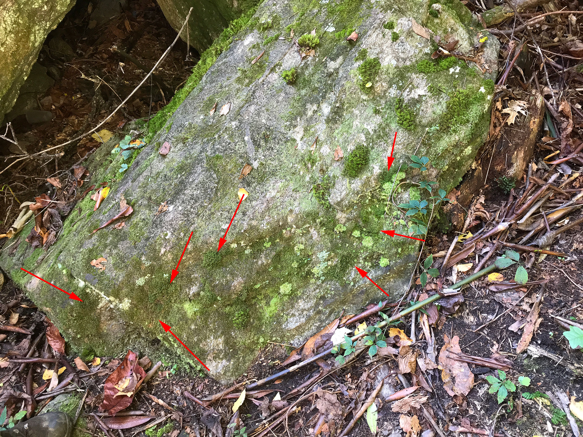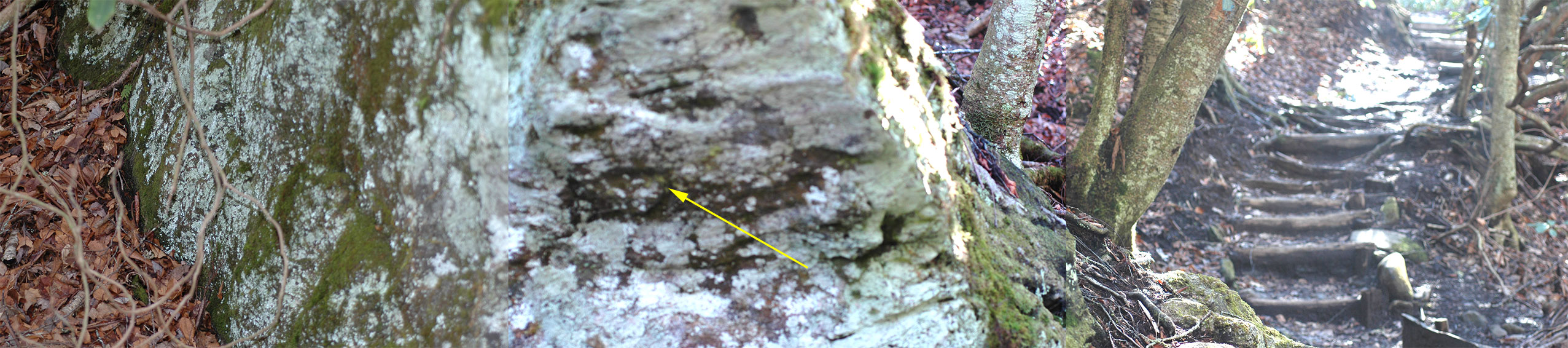 The trail seen at right is immediately above a foot bridge over a stream. The nose of this rock outcrop (at yellow arrow) supports a small population of P. caduciloba with numerous shoots of reduced size bearing predominantly bilobed leaves (see 5th image below). The brownish green patches on the left side of this outcrop support robust material of Plagiochila retrorsa.