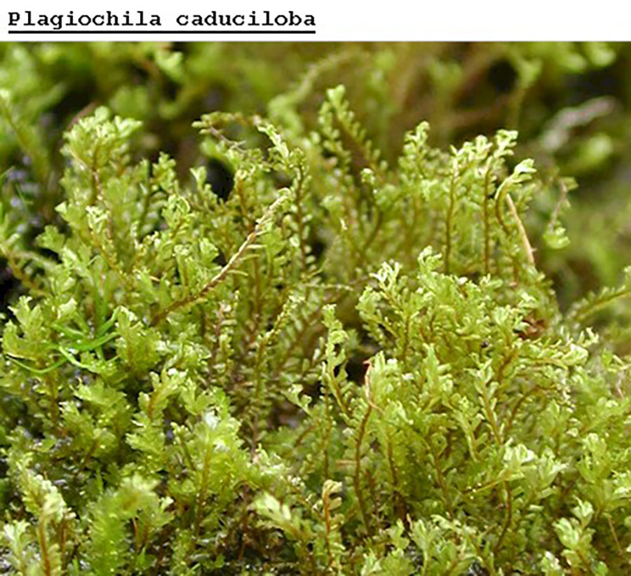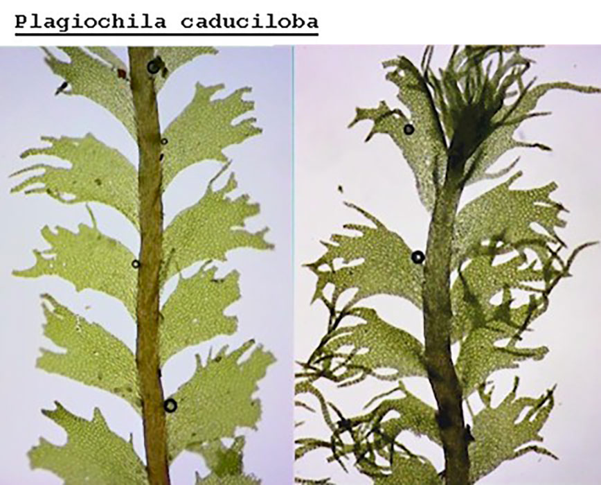 Plagiochila caduciloba typically avoids very wet substrates and the direct splash of spray zones. It has been found in very close proximity to the wet-loving species Acrobolbus ciliatus, Diphyscium cumberlandianum, Hookeria acutifolia, and Metzgeria leptoneura. It is considered a component of the spray cliff community (Zartman and Pittillo 1998). Like many cryptogams, P. caduciloba grows under conditions of prolonged humidity and low, albeit adequate, light levels. The low light may eliminate competition with more light demanding species. Many liverworts may occur under the same conditions including the following partial list of consociated species: Bazzania denudata, Blepharostoma trichophyllum, Harpalejeunea ovata, Herbertus, Lejeunea lamacerina subsp. geminata, L. laetivirens, Leucolejeunea clypeata, Lophocolea muricata, Microlejeunea ulicina, Plagiochila austini, P. porelloides, P. retrorsa, P. virginica, Radula obconica, R. sullivantii, and R. tenax. Notable tracheophyte associates include the fern gametophytes of Grammitis nimbata, Hymenophyllum tayloriae, Trichomanes intricatum, and Vittaria appalachiana.