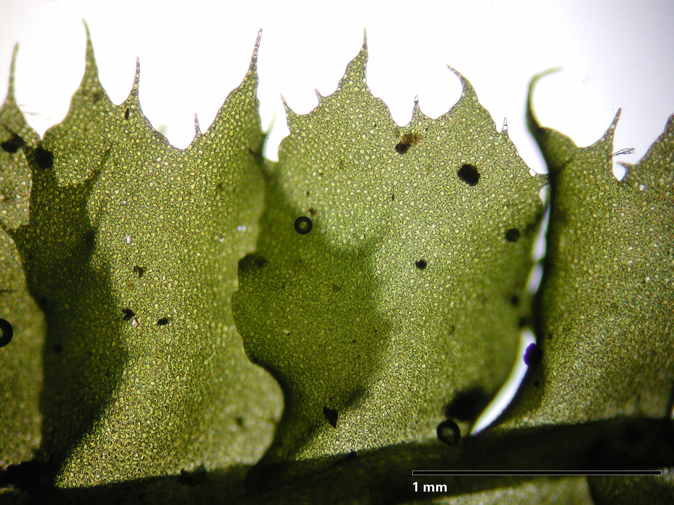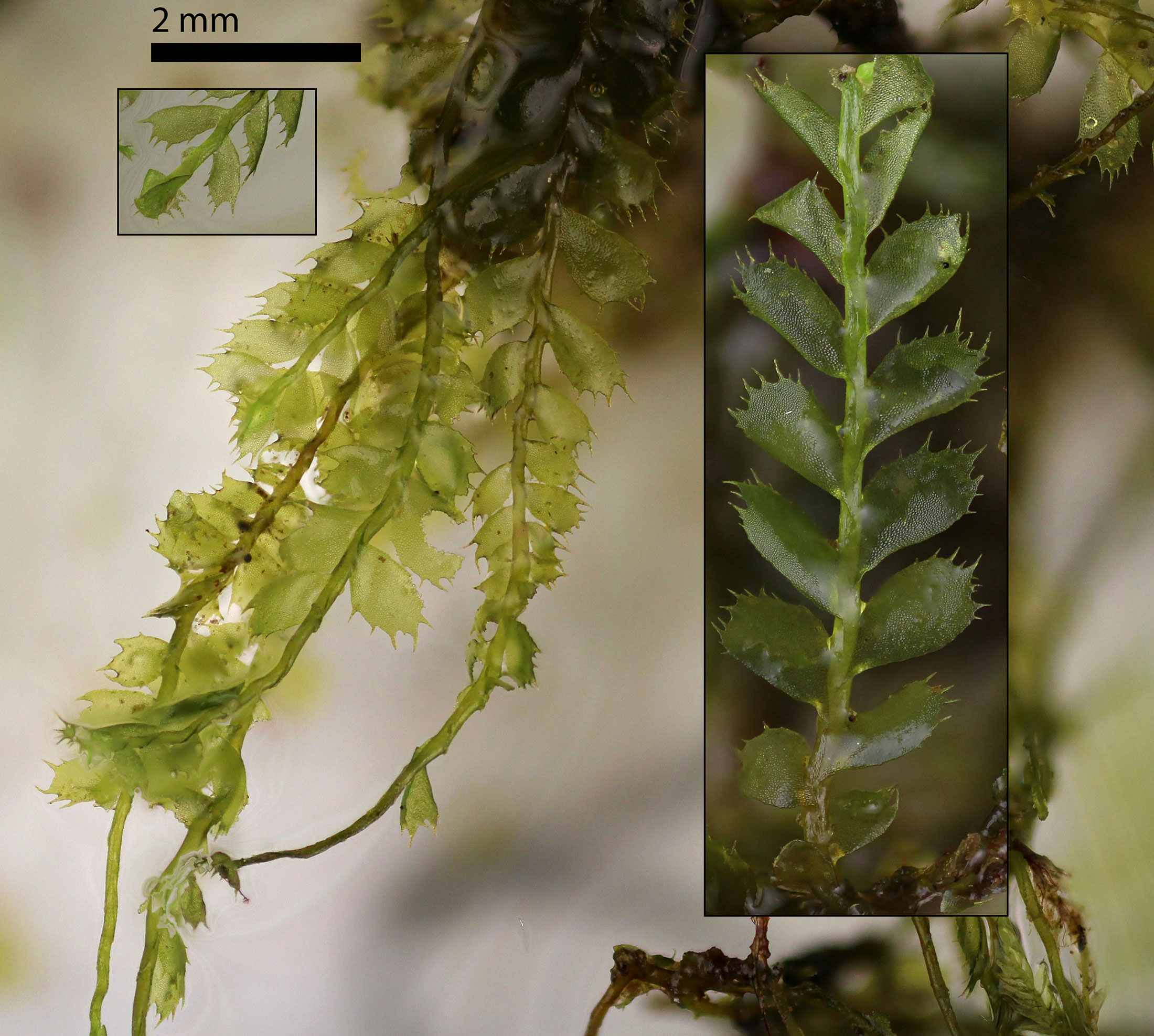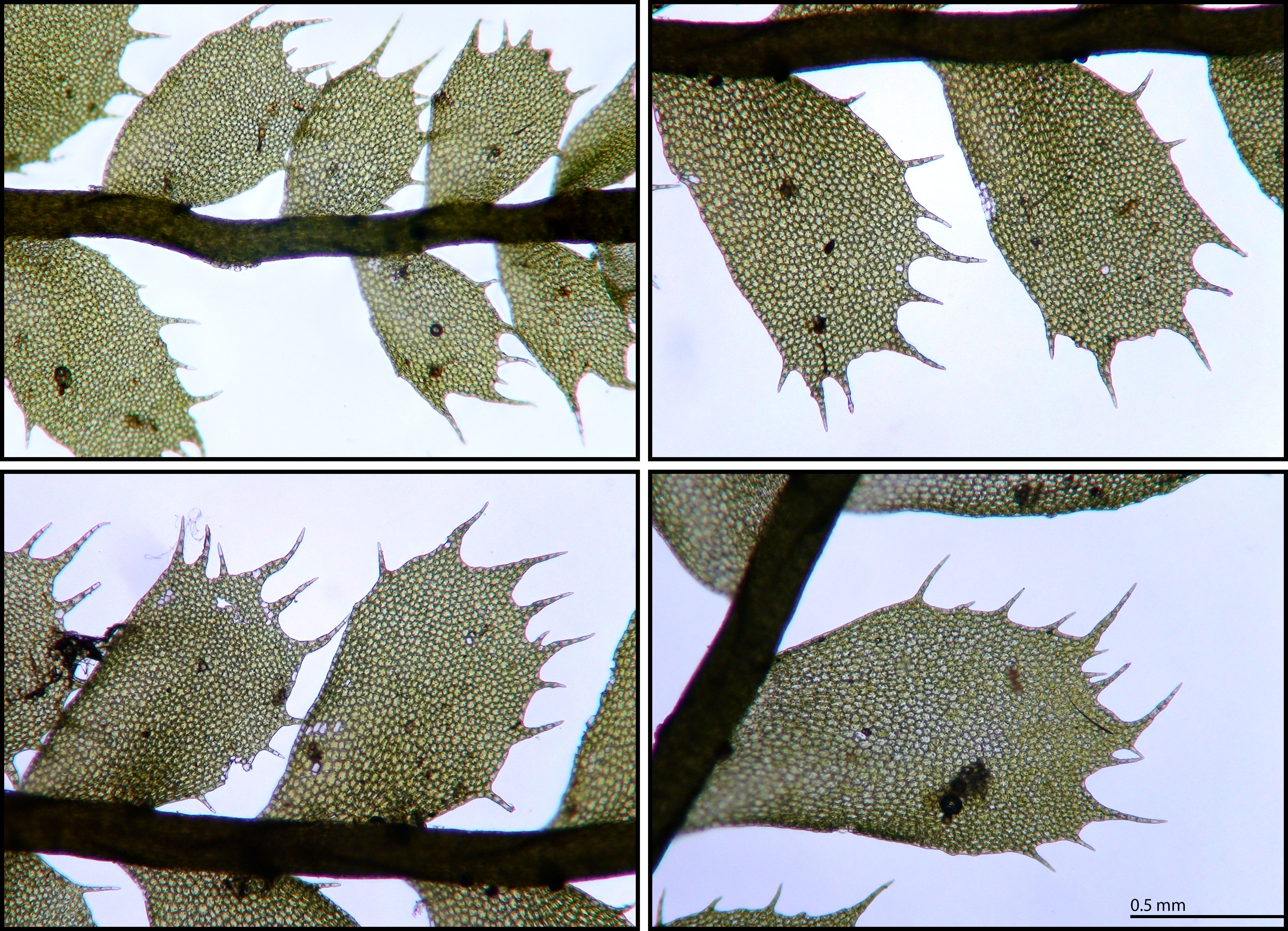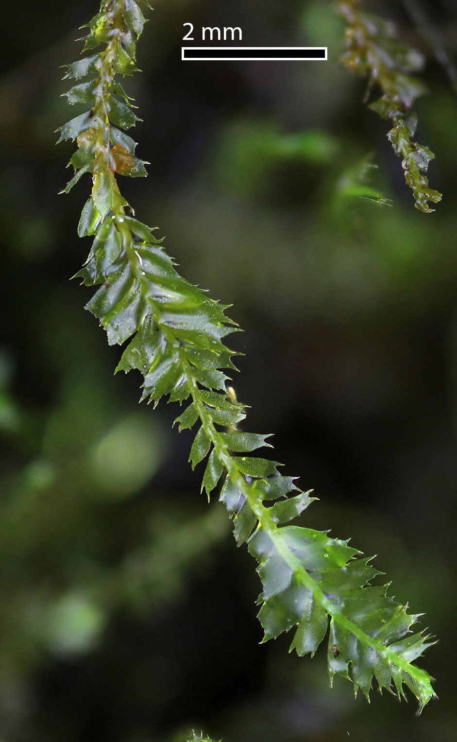 Forming loose mats, sometimes extensive, 20 cm or more in diameter, or as few shoots spread thinly over substrate. Shoots to 3.5 mm wide, green to brownish, shiny when dry. Leaves spreading, only slightly altered when dry, broad to the base from a wide apex. Leaf margin with teeth spinose to cilia-like.