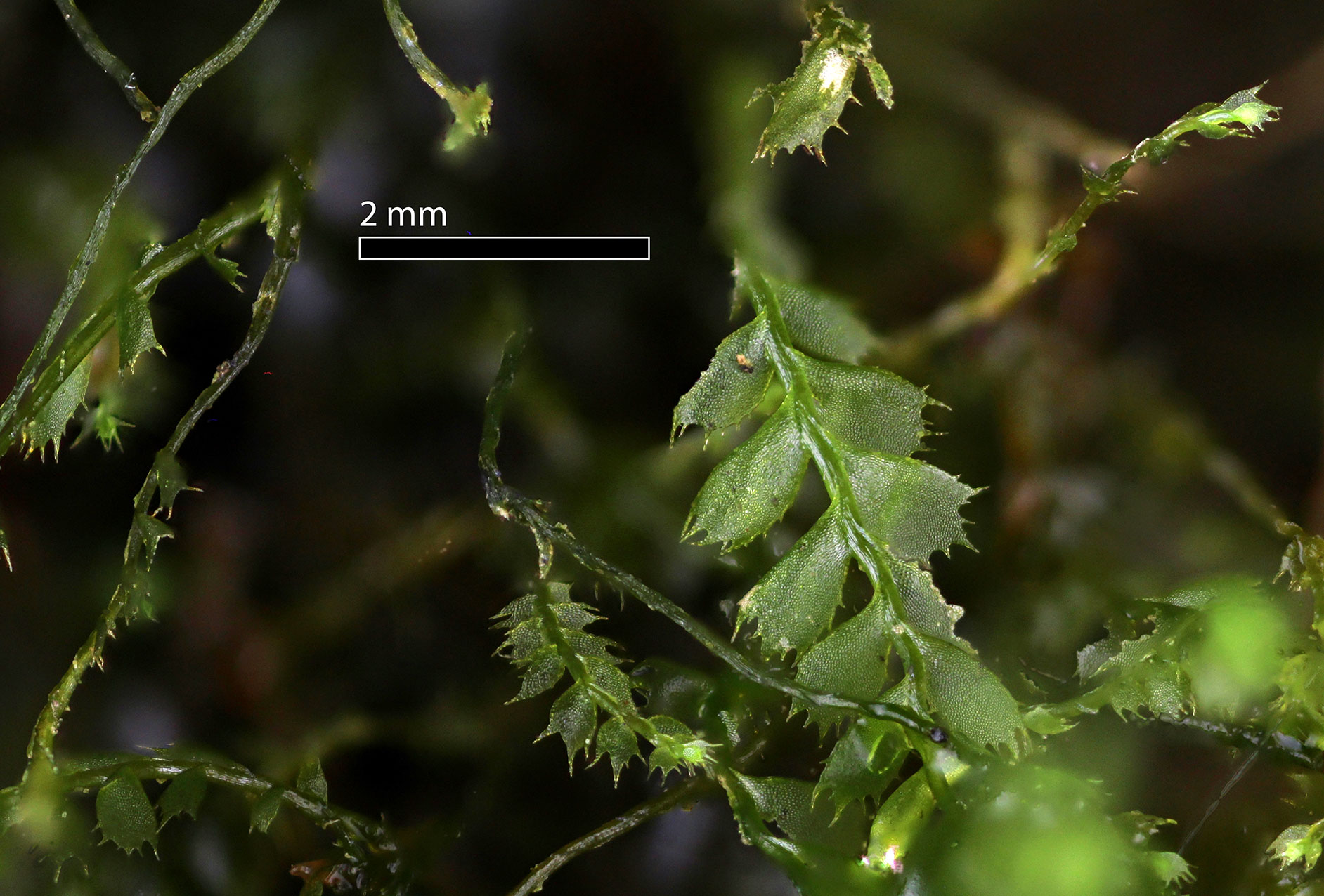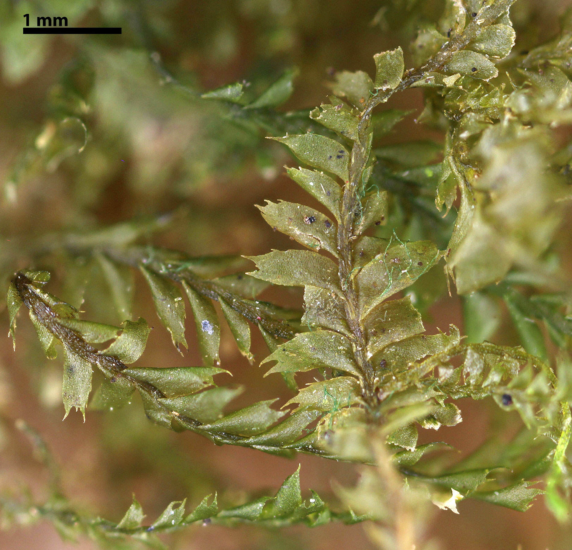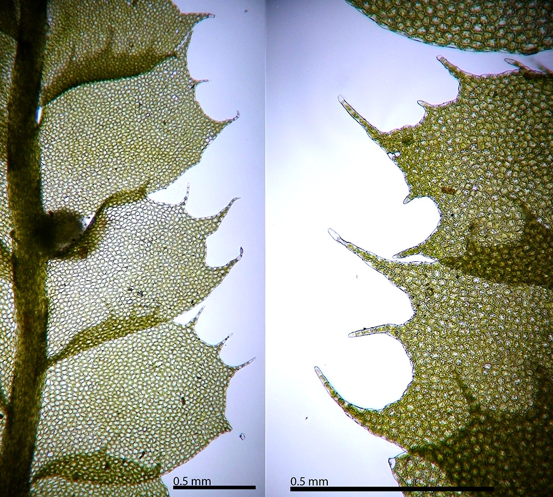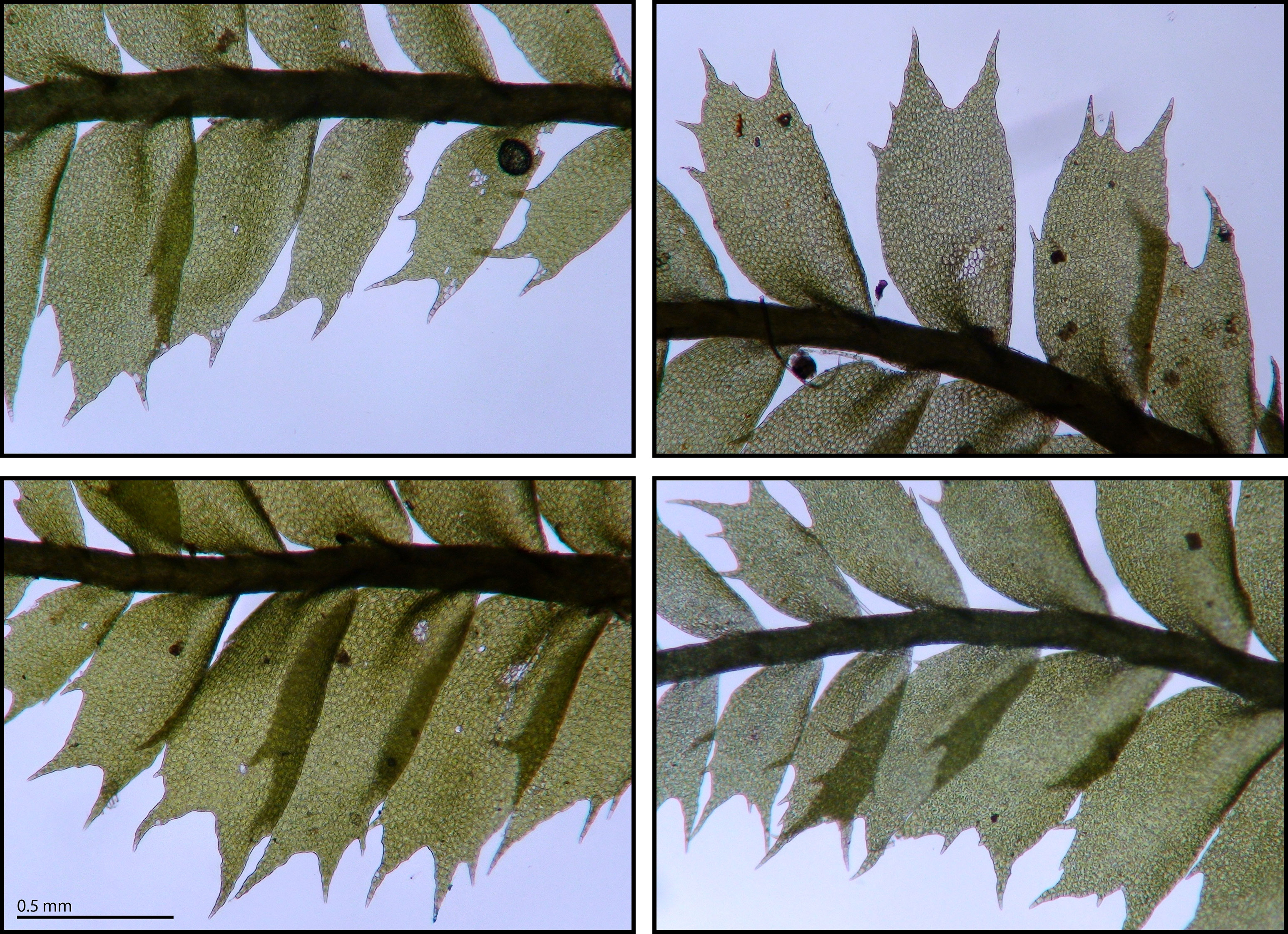Forming loose mats, sometimes extensive, 20 cm or more in diameter, or as few shoots spread thinly over substrate. Shoots to 3.5 mm wide, green to brownish, shiny when dry. Leaves spreading, only slightly altered when dry, broad to the base from a wide apex. Leaf margin with teeth spinose to cilia-like.