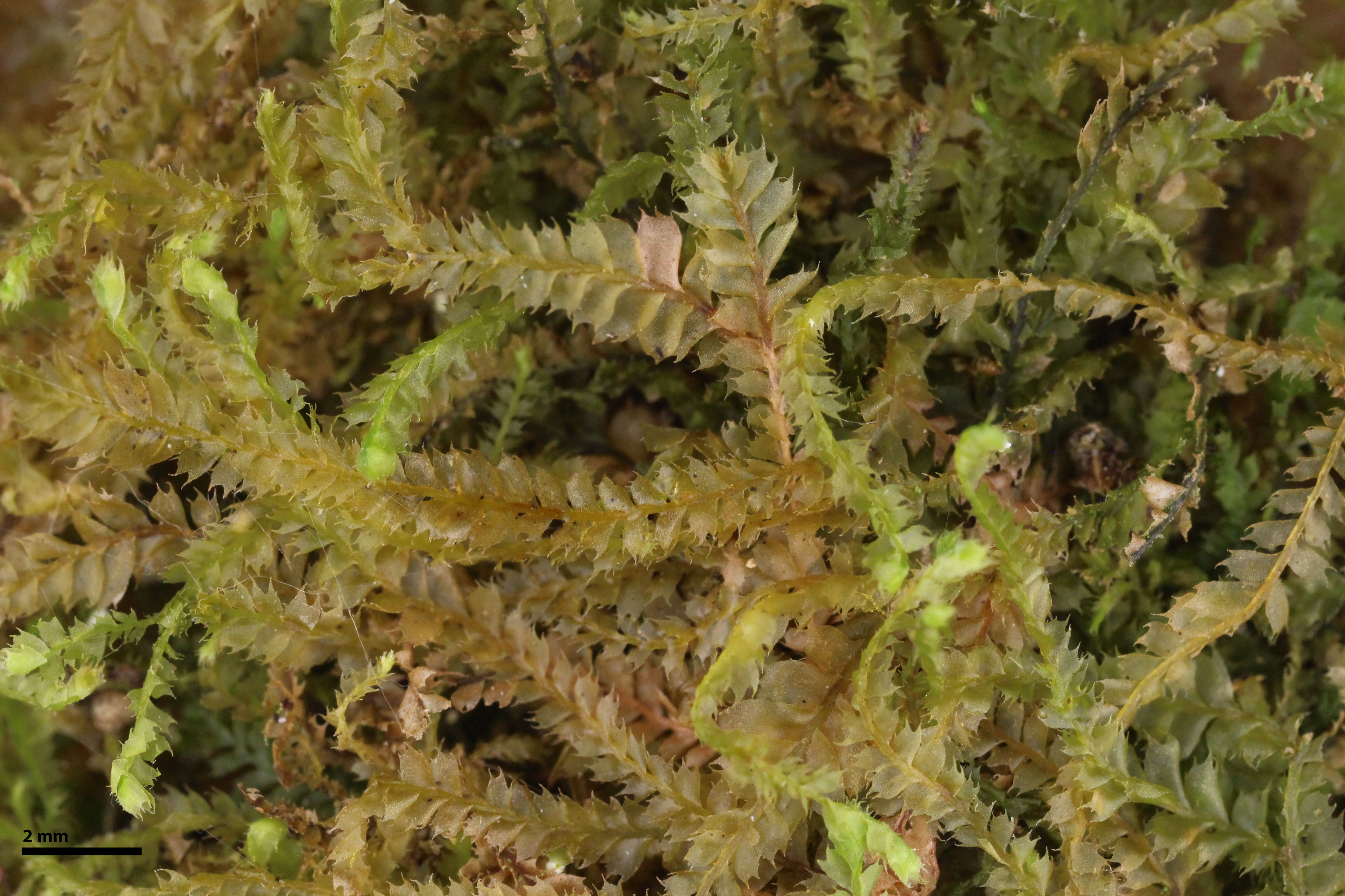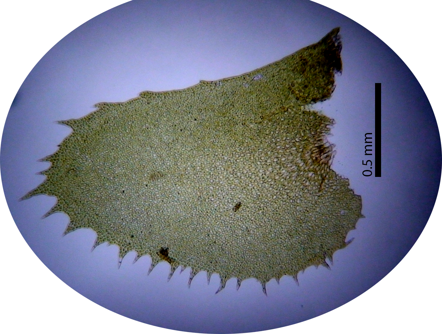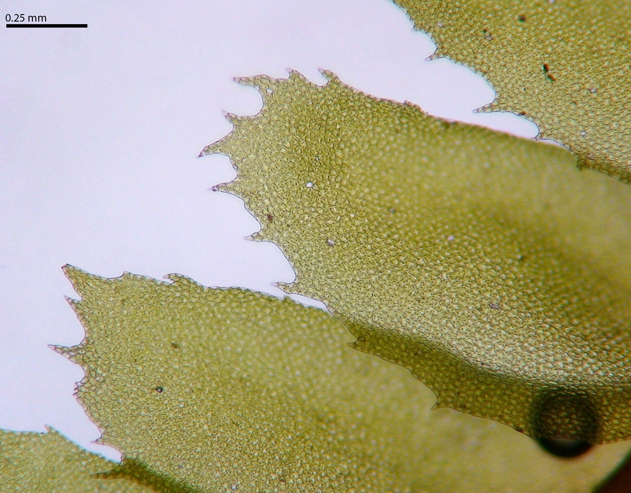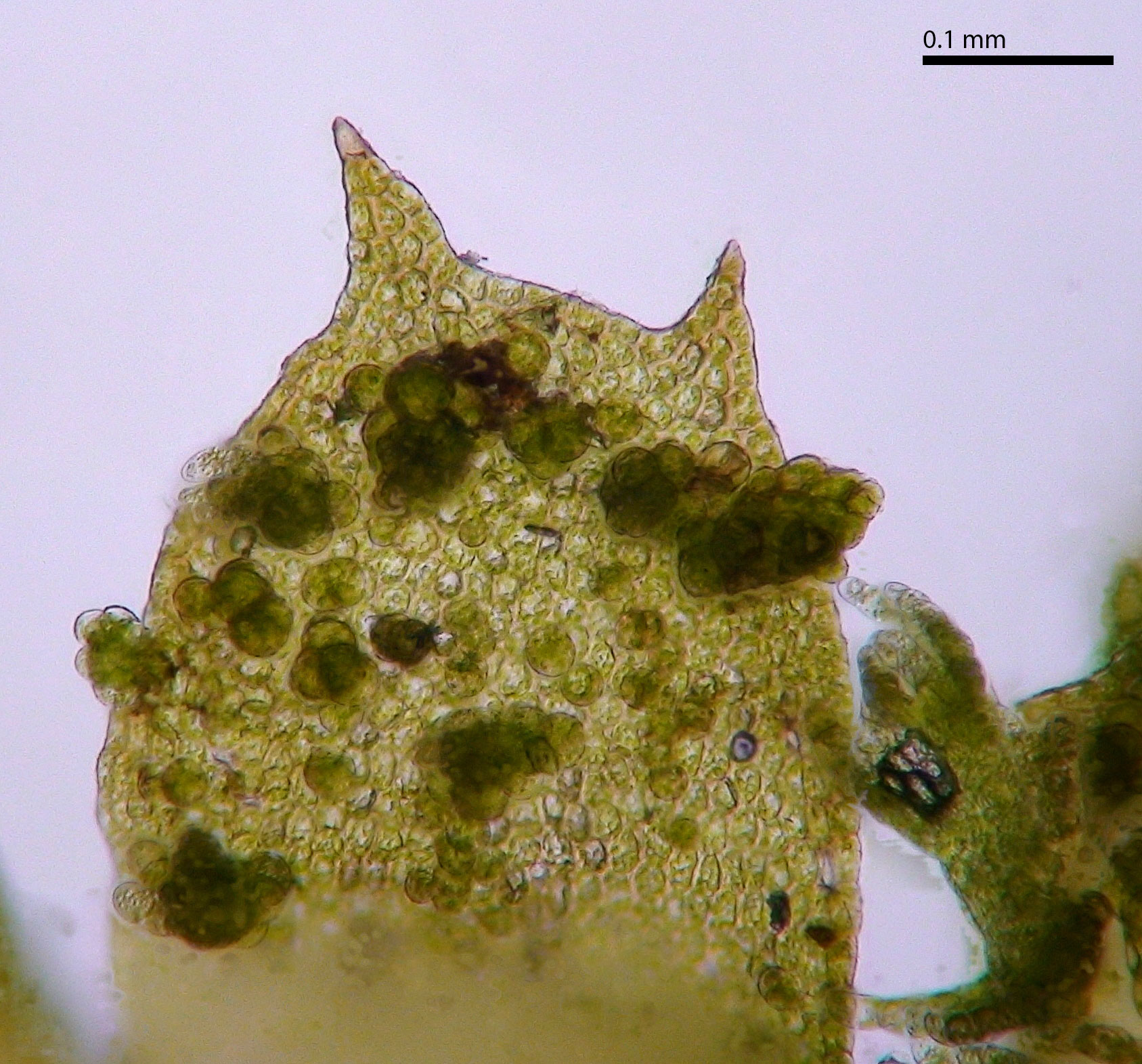 Forming loose mats, sometimes extensive, 20 cm or more in diameter, or as few shoots spread thinly over substrate. Shoots to 3.5 mm wide, green to brownish, shiny when dry. Leaves spreading, only slightly altered when dry, broad to the base from a wide apex. Leaf margin with teeth spinose to cilia-like.