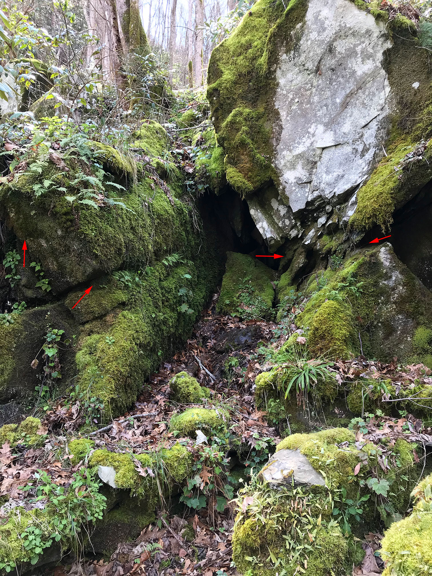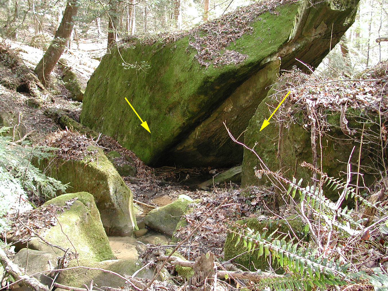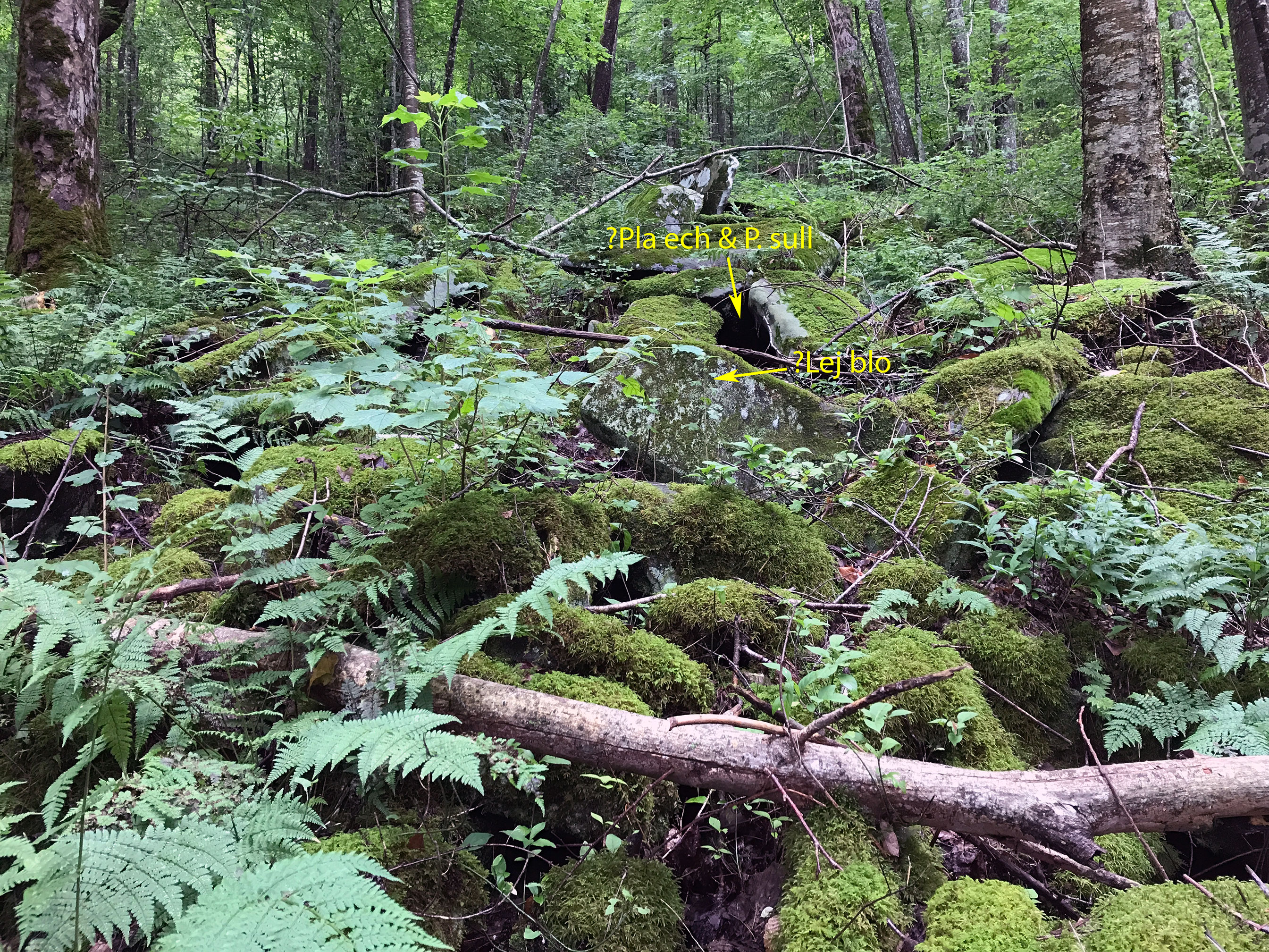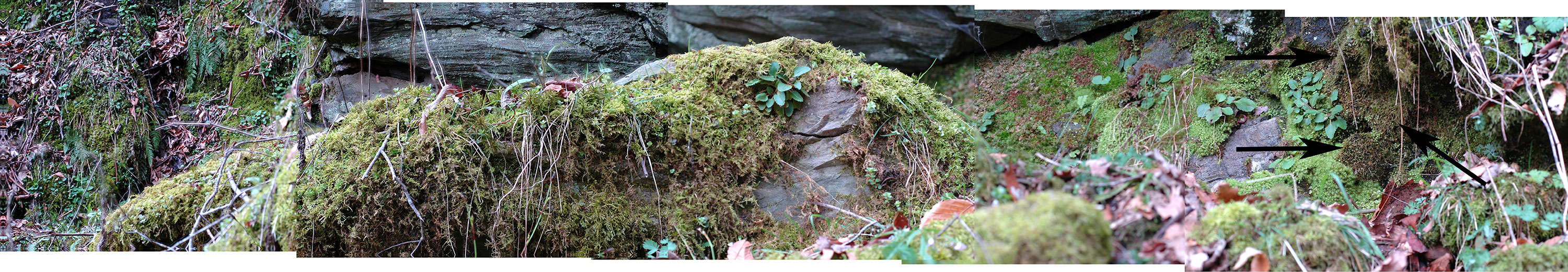 Stream ravines of cove hardwood forests; moist boulder slopes in northern hardwood forests. Moderate elevations (550 – 4500 ft). Occurring on sheltered, vertical rock walls, on ceilings of cave-like boulder crevices, in shaded rock crevices often wet from seepage and the proximity of falling water, e.g. spray cliffs of the Blue Ridge Escarpment (see Zartman and Pittillo 1998).