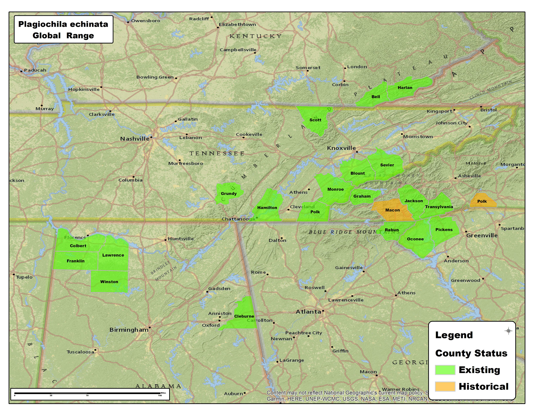 Endemic to southeastern U.S.A. Alabama, Georgia, Kentucky, North Carolina, South Carolina, Tennessee. Restricted to the Appalachian Plateaus and Blue Ridge physiographic provinces with a single record from the Piedmont of Alabama.