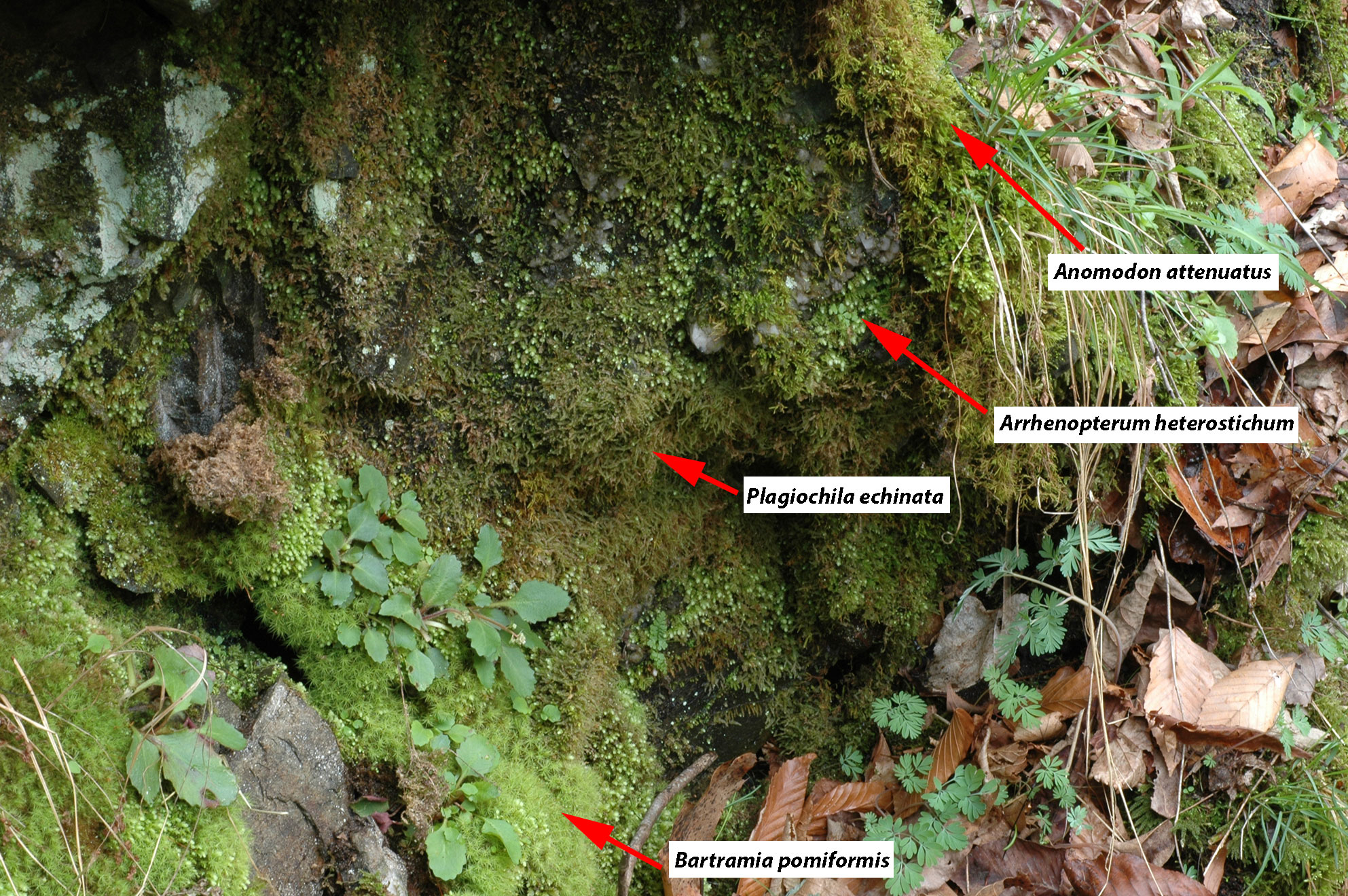 Occurring with a rich mix of ecological associates presumably due to optimum conditions of humidity and moisture conducive to shade loving bryophytes. Commonly found with the filmy fern Trichomanes petersii. Associated liverworts: Calypogeia muelleriana, Jubula, Lejeunea laetivirens, Metzgeria leptoneura, M. myriopoda, Plagiochila appalachiana, P. porelloides, P. sullivantii, P. virginica, Porella japonica subsp. appalachiana, Radula obconica, R. sullivantii, R. tenax. Associated mosses: Arrhenopterum heterostichum, Bartramia pomiformis, Bryoandersonia, Ctenidium molluscum, Hookeria acutifolia, Isopterygium elegans, Plagiomnium carolinianum, P. ciliare, Thamnobryum alleghaniense.