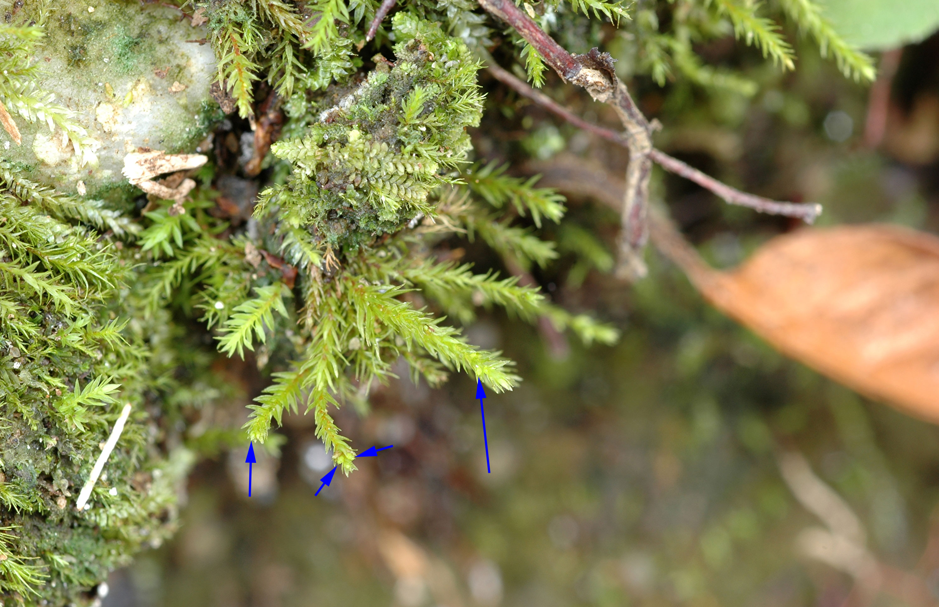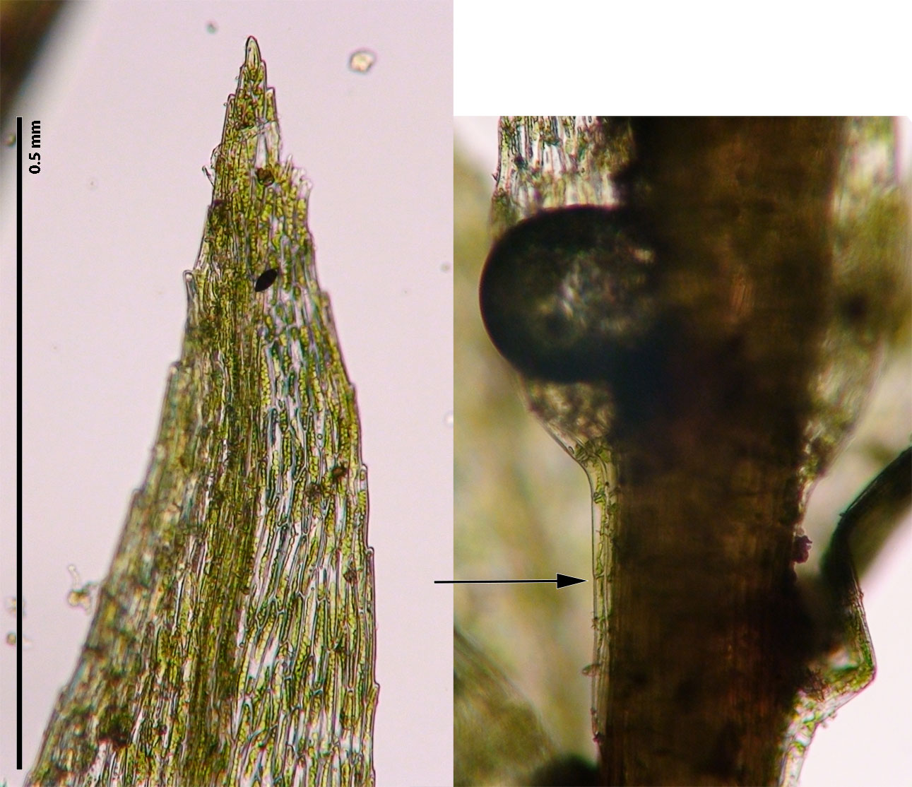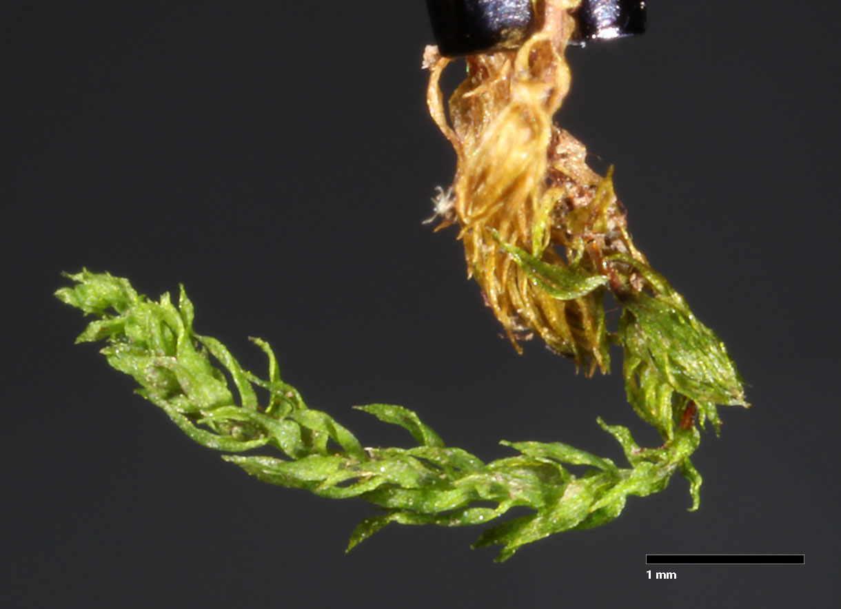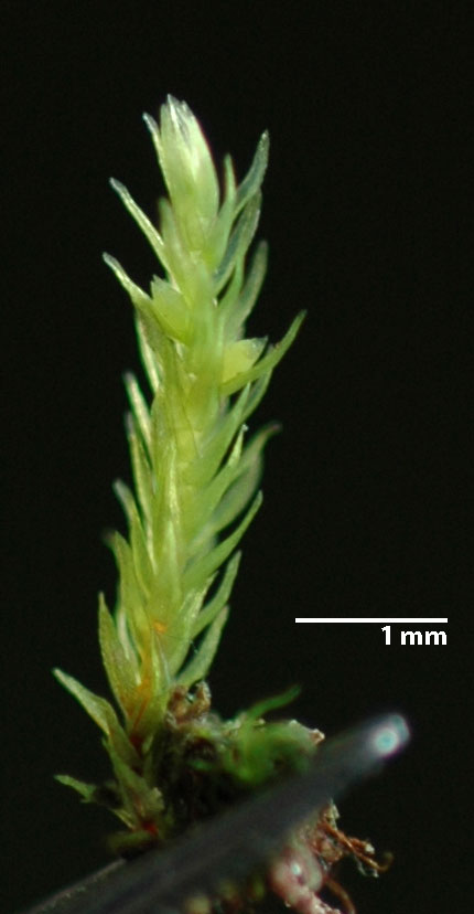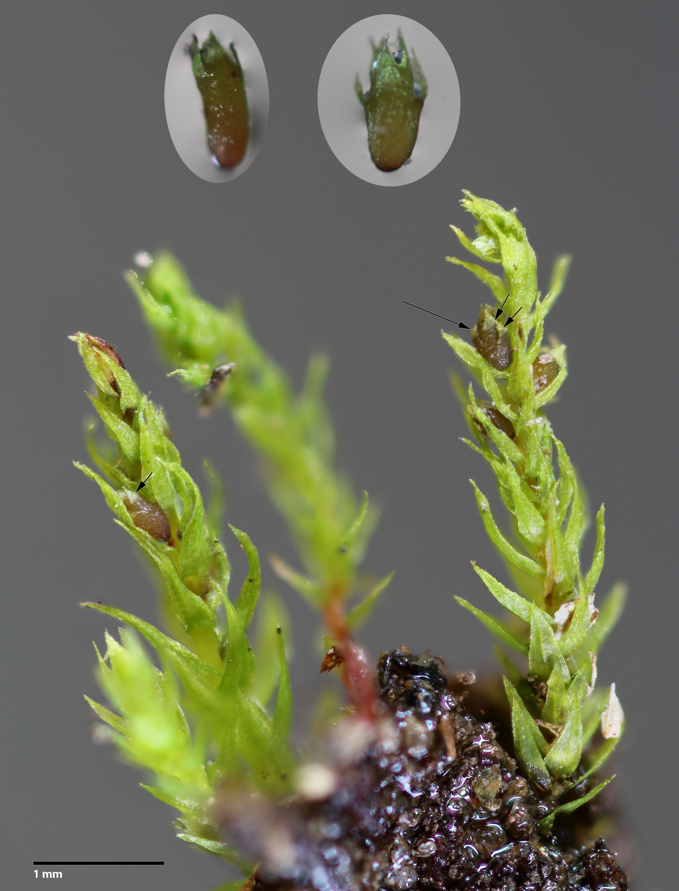 Forming loose tufts on soil, sometimes intermingled with other mosses. Shoots mostly unbranched, to 1 cm long, upright, often at a low angle to the substrate. Leaves lanceolate, costate, ca. 1 mm long, erect to spreading. Leaves are dull and slightly contorted when dry. Bulbiform gemmae green becoming orange-red when mature, occurring singly in a few leaf axils of some shoots. Gemmae with triangular leaf primordia near the gemma apex and also lower on the body of the gemma.