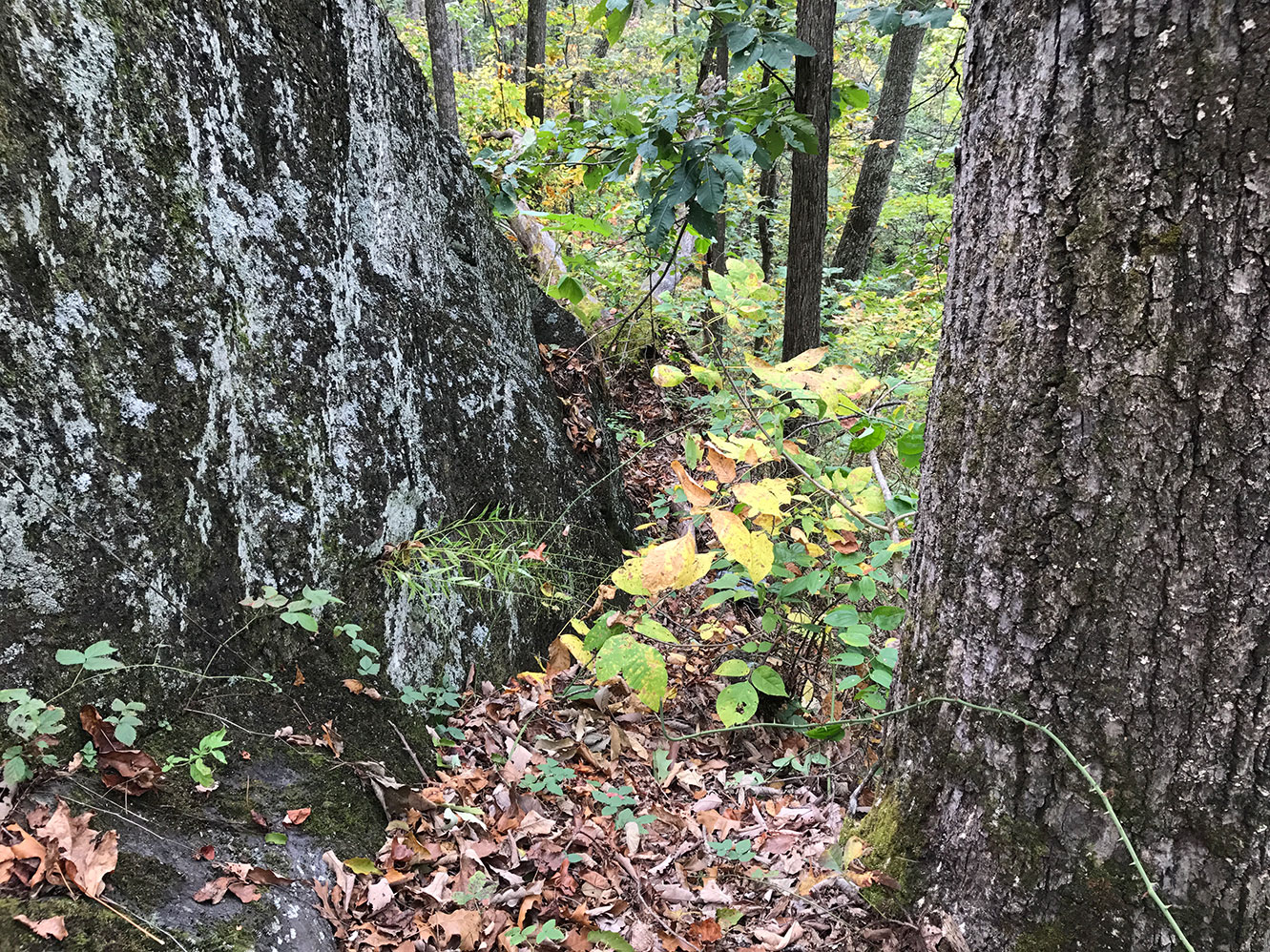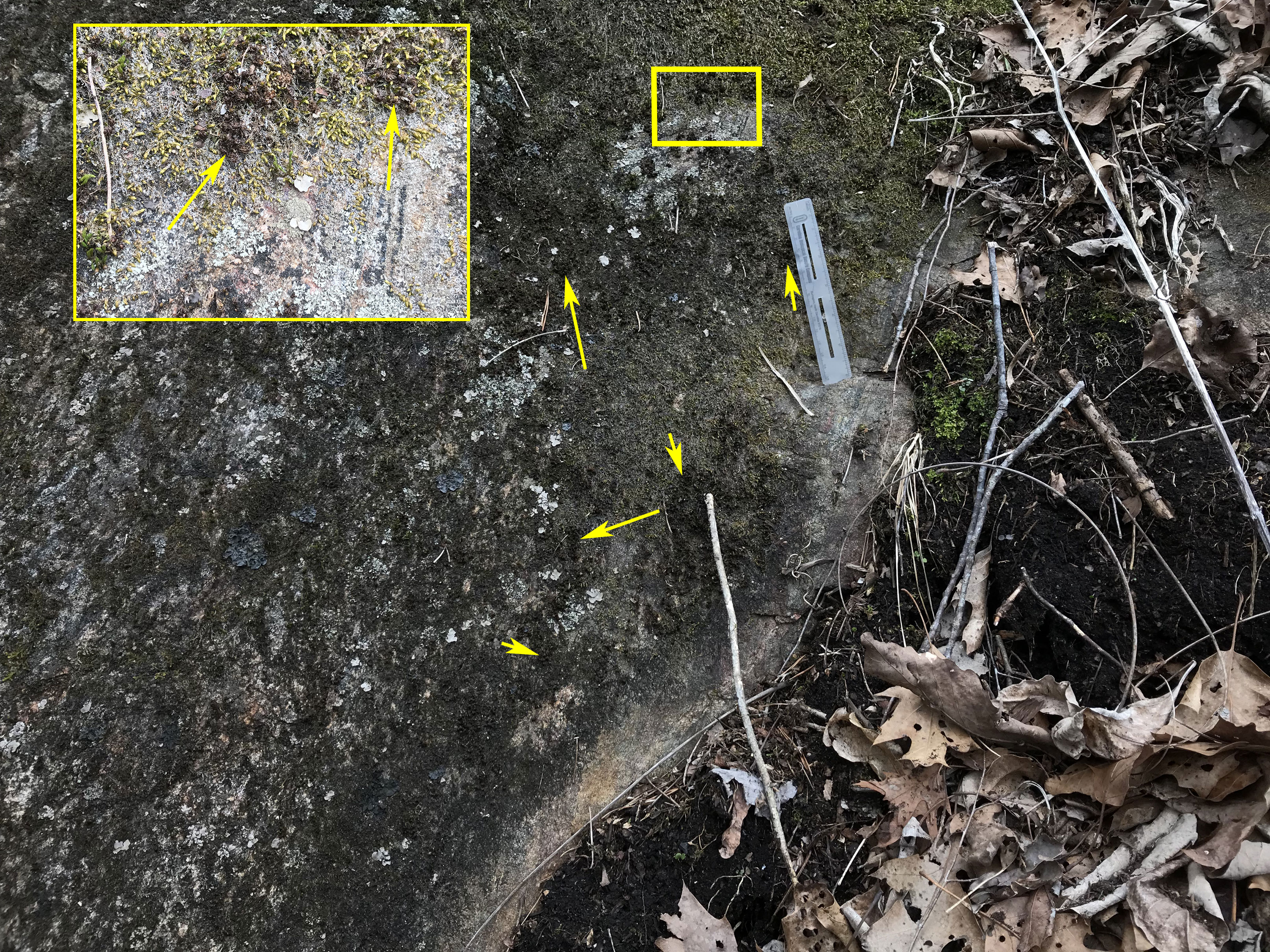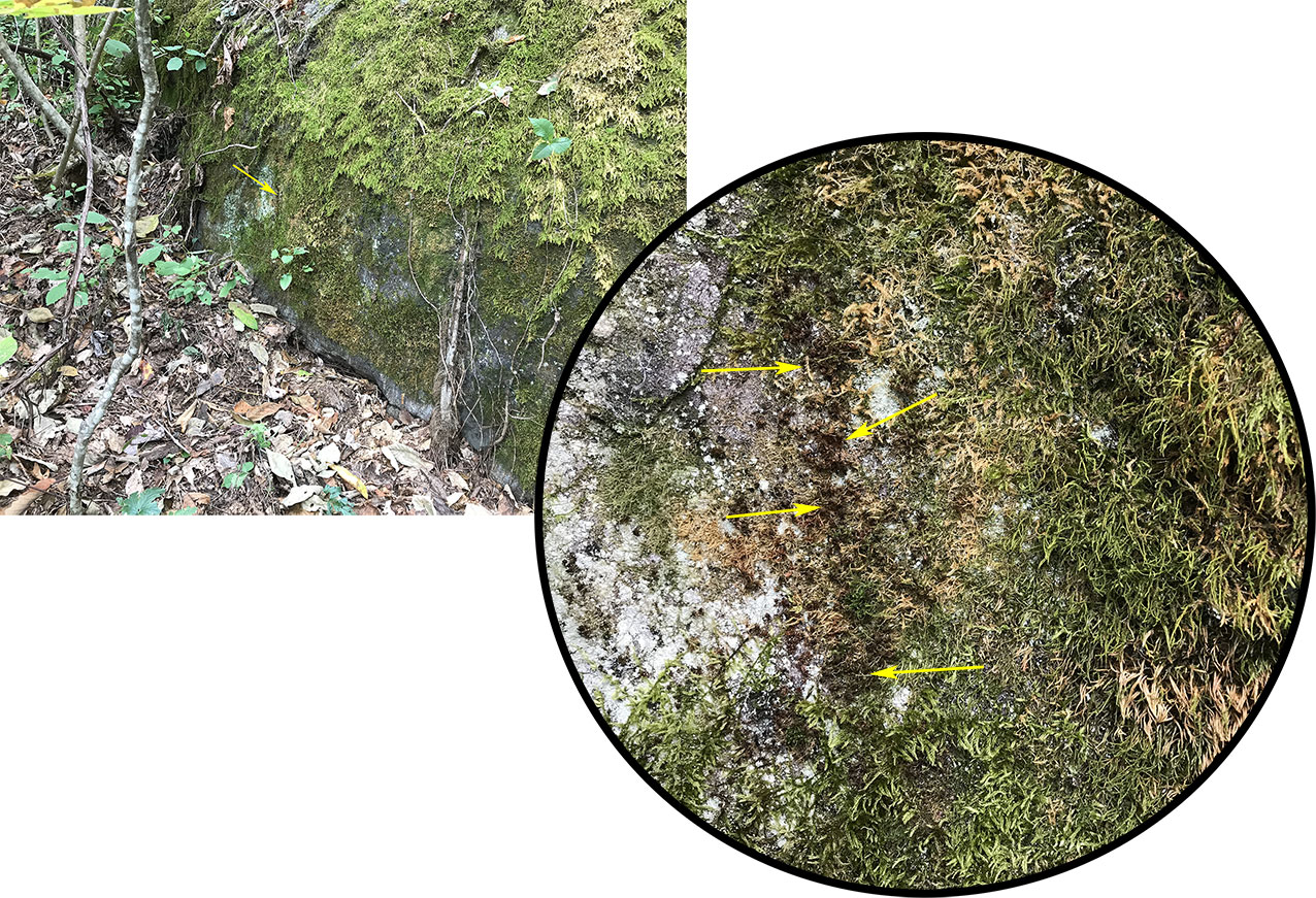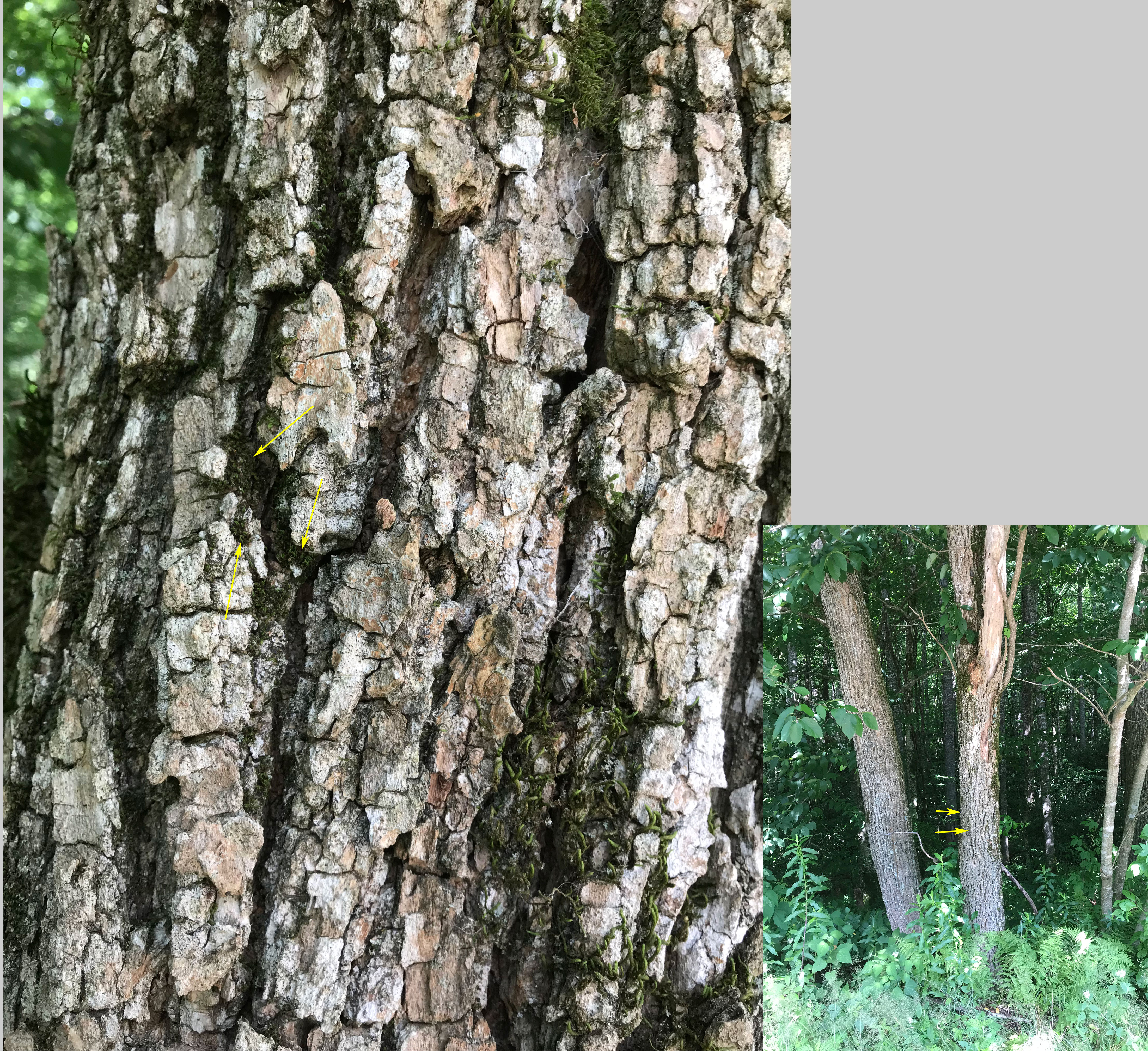 Yellow arrows indicate tufts of S. amphidiacea growing in bark crevices of a roadside black locust tree at Winding Stair Gap, SW of Franklin, NC.
