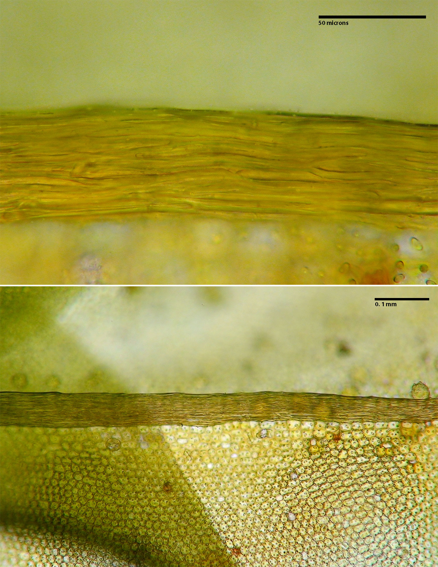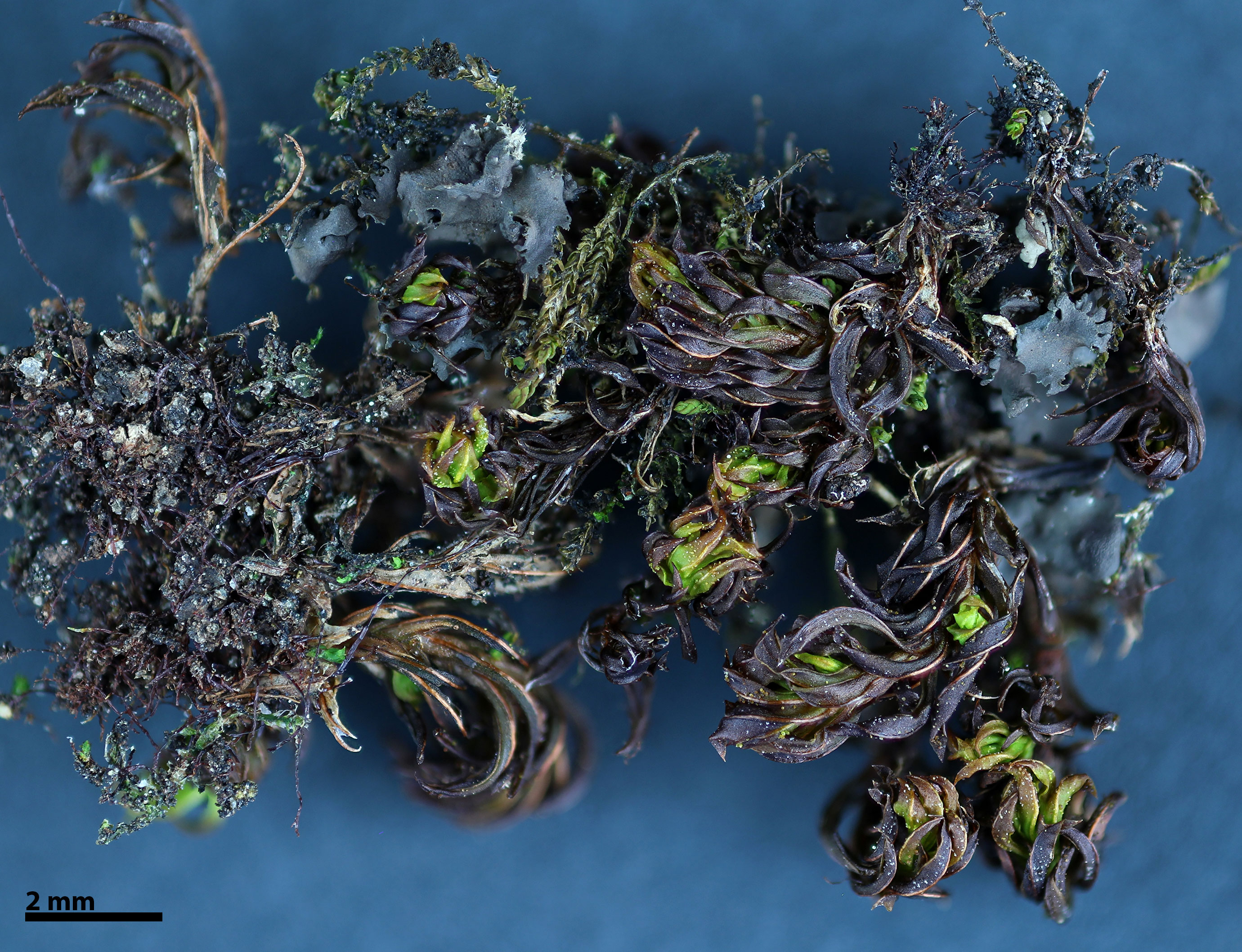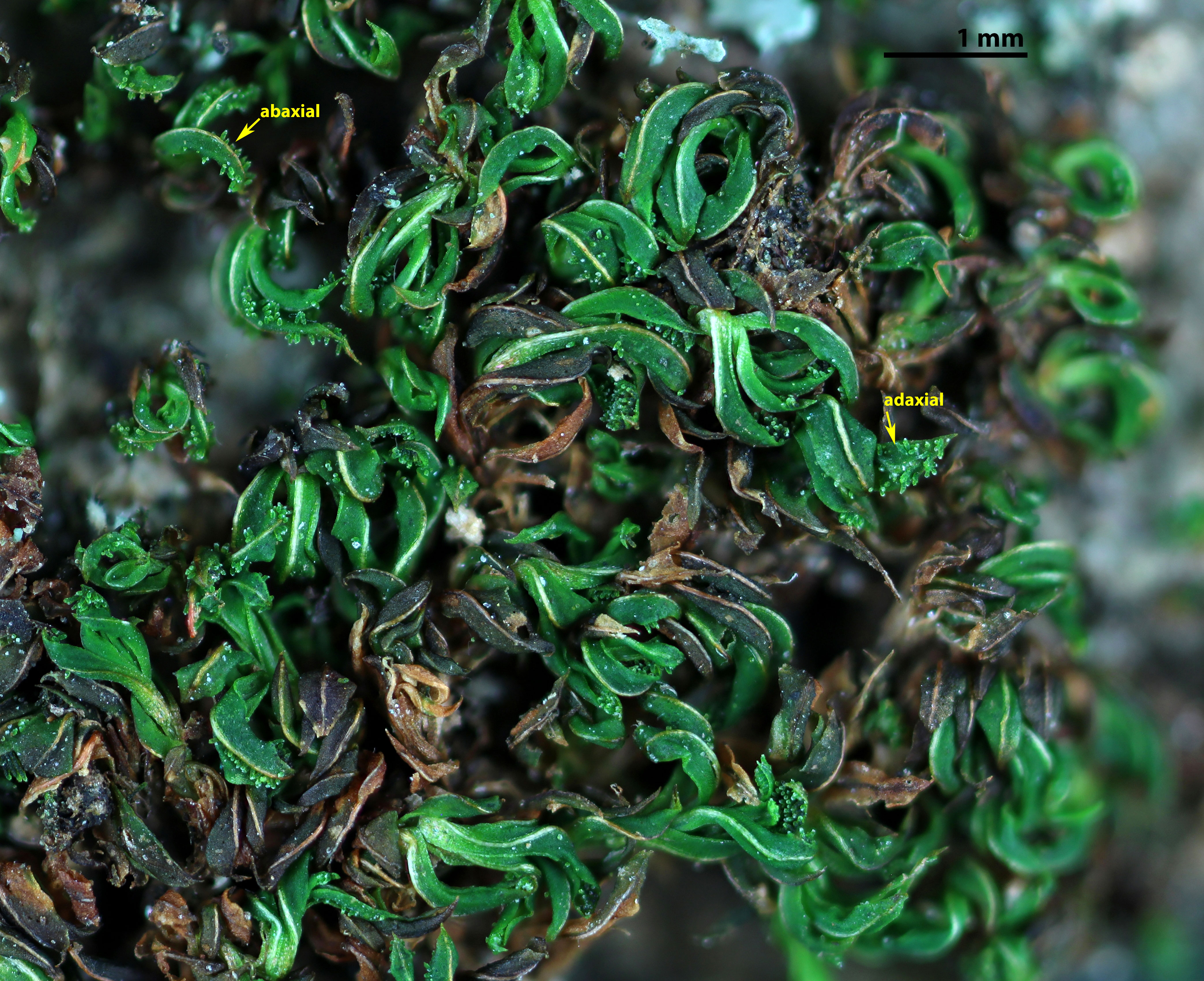 Loosely tufted on rock or bark, stems erect, 2 -15 (-25) mm tall. Dry plants green to brown; new growth green when moist. Leaves keeled, incurved, twisted, and only slightly contorted when dry, flat and wide-spreading when moist, narrowly or broadly spatulate. Leaves costate, costa ending a few cells before the apex or percurrent (extending to the apex), costa smooth at back. Leaf laminal cells pluripapillose. Leaf margins revolute in lower ½ - ¾, entire. Cylindrical propagula common on adaxial and especially abaxial leaf surfaces.