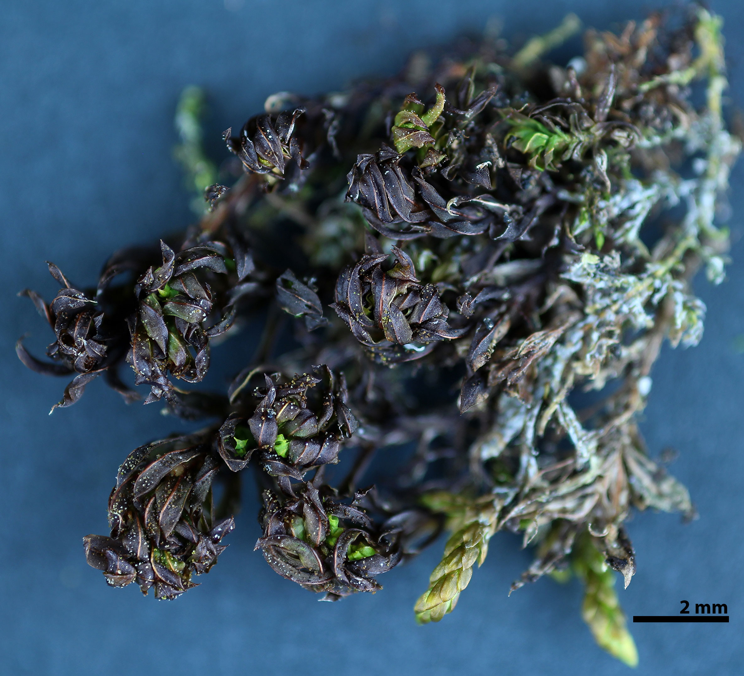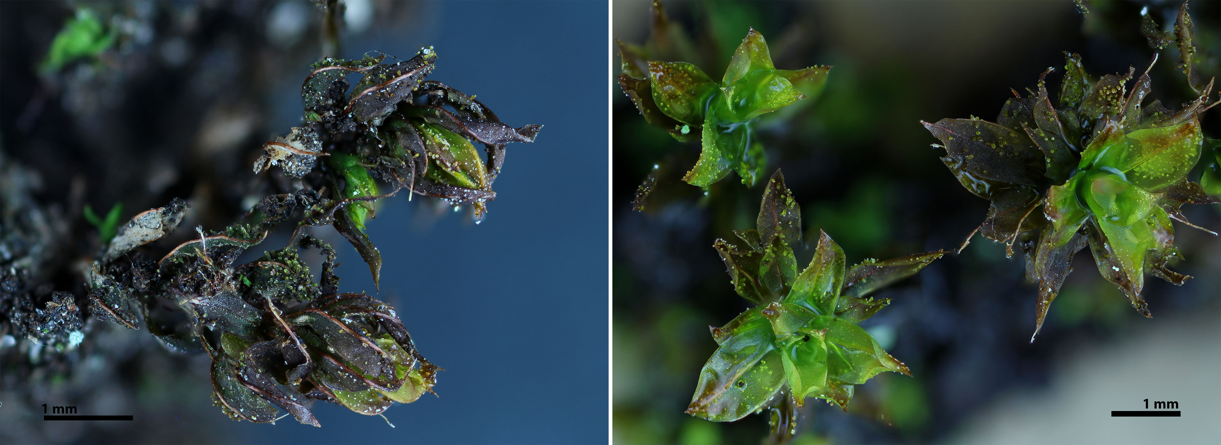 The numerous, globular and cylindrical speckles over the leaf surfaces are immature and mature propagula, respectively. Hydrated plants at right.