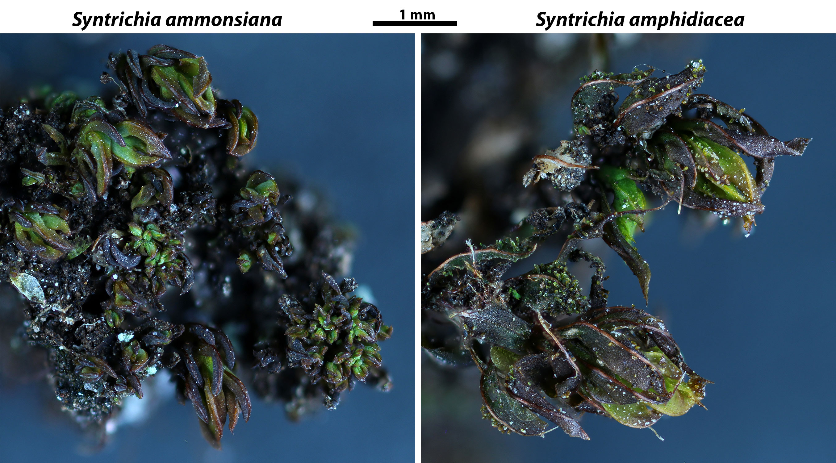 Regionally, Syntrichia amphidiacea is similar to Syntrichia ammonsiana and Syntrichia papillosa, yet distinctions between these are obvious once characters are understood. S. ammonsiana stands apart in its leaflike propagula and leaf margins that are plane, not revolute. S. papillosa bears spherical to ovoid propagula on the adaxial surface of the costa, leaf cells are unipapillose on the lower surface, and leaves end in an awn.