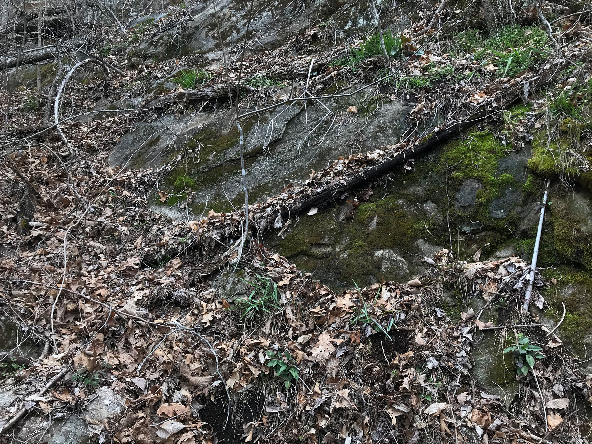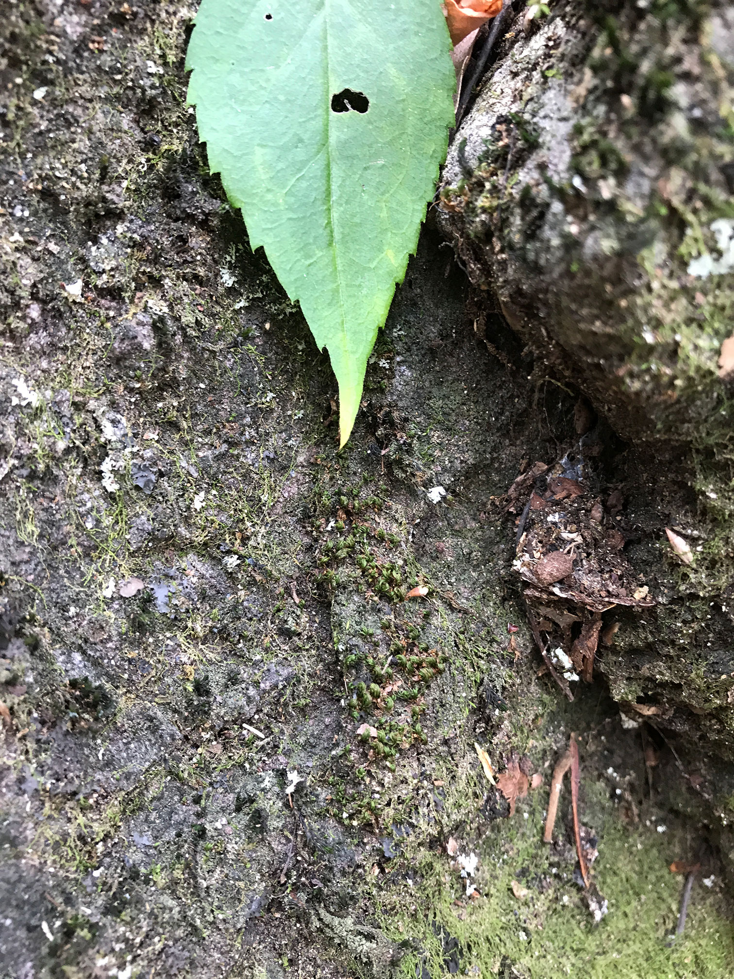 Closeup of previous outcrop with a green leaf used to point to a line of tufted plants of S. amphidiacea.