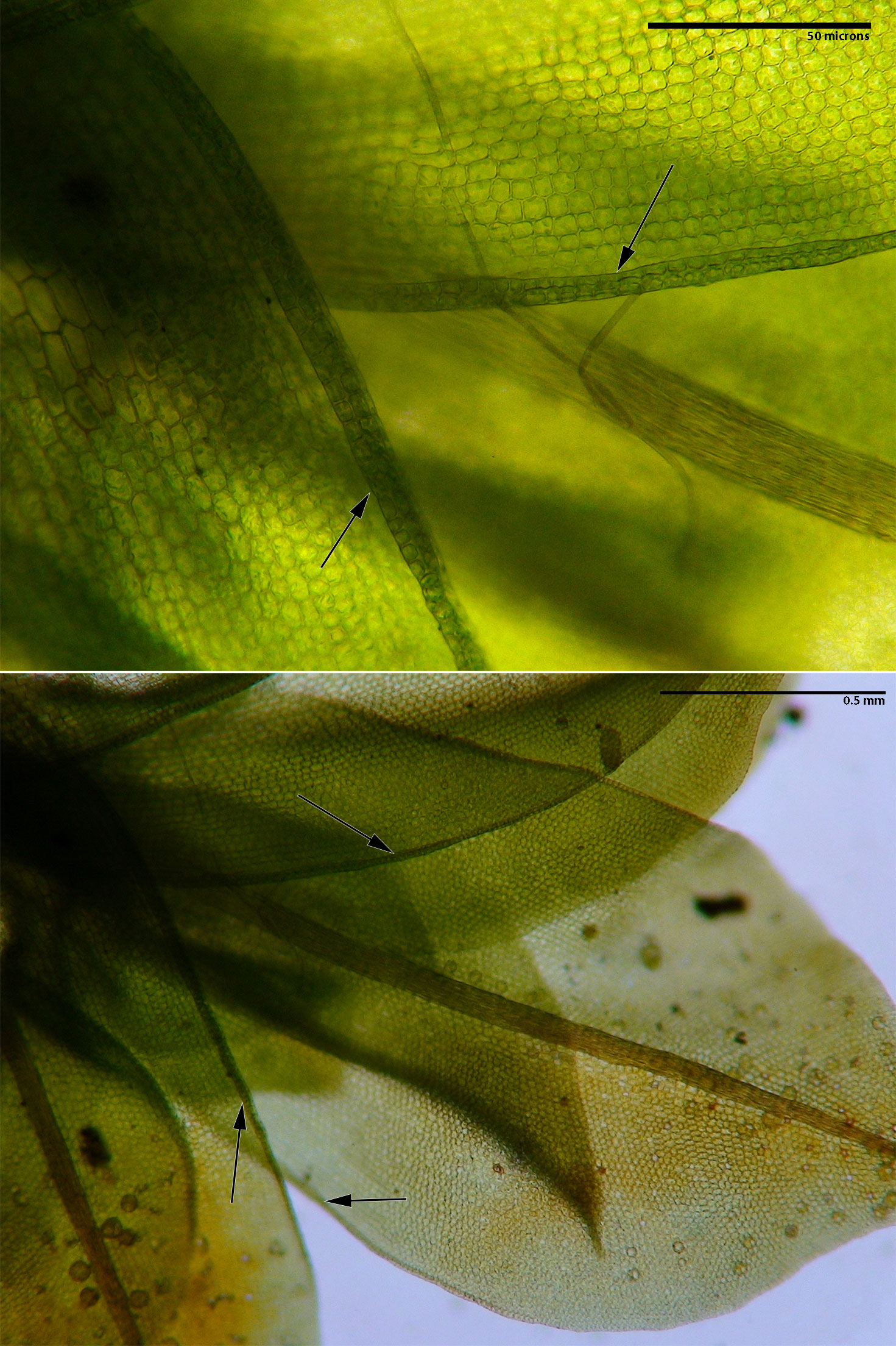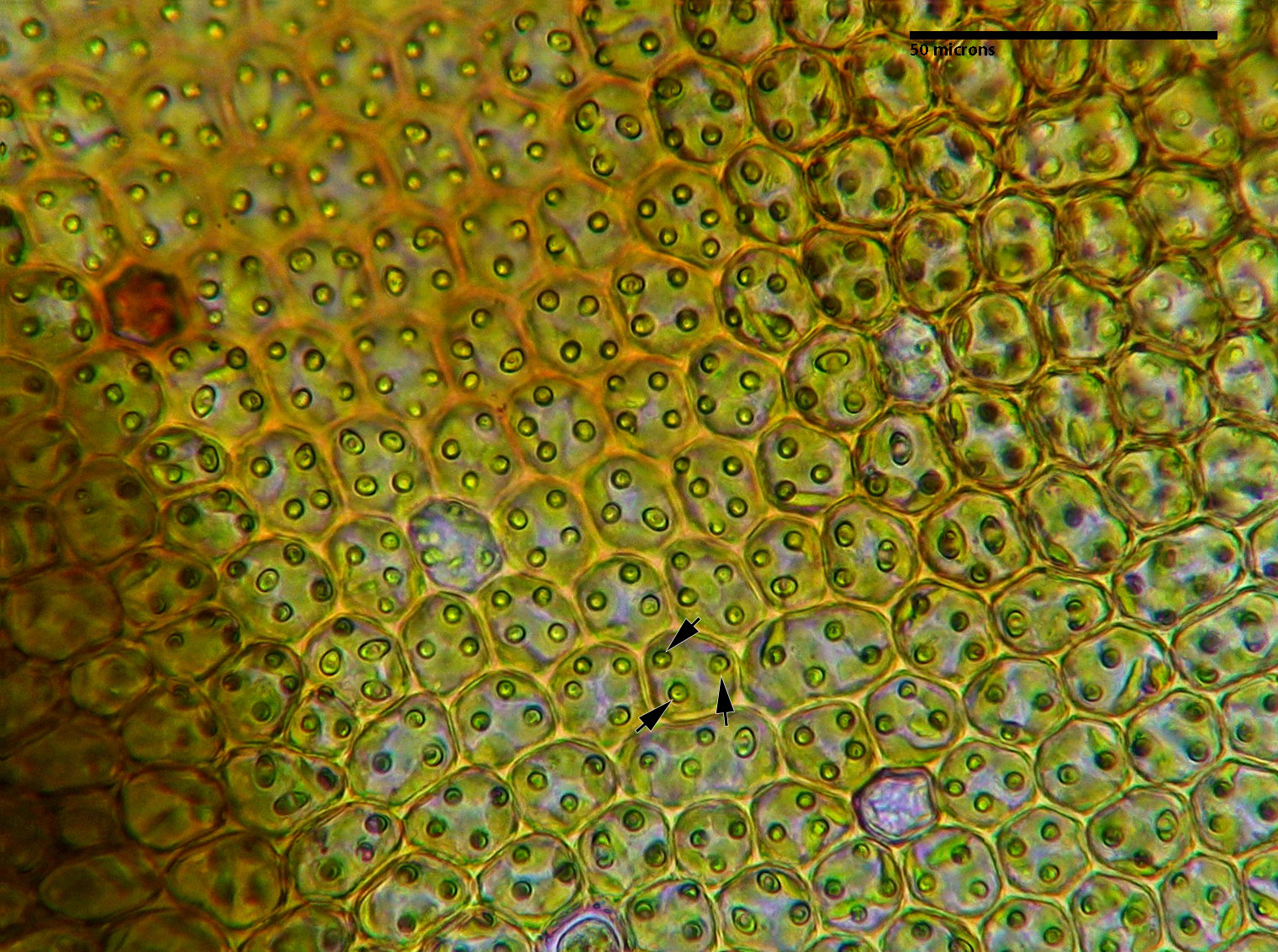 Leaf laminal cells are pluripapillose. Arrows indicate individual papillae of one cell.