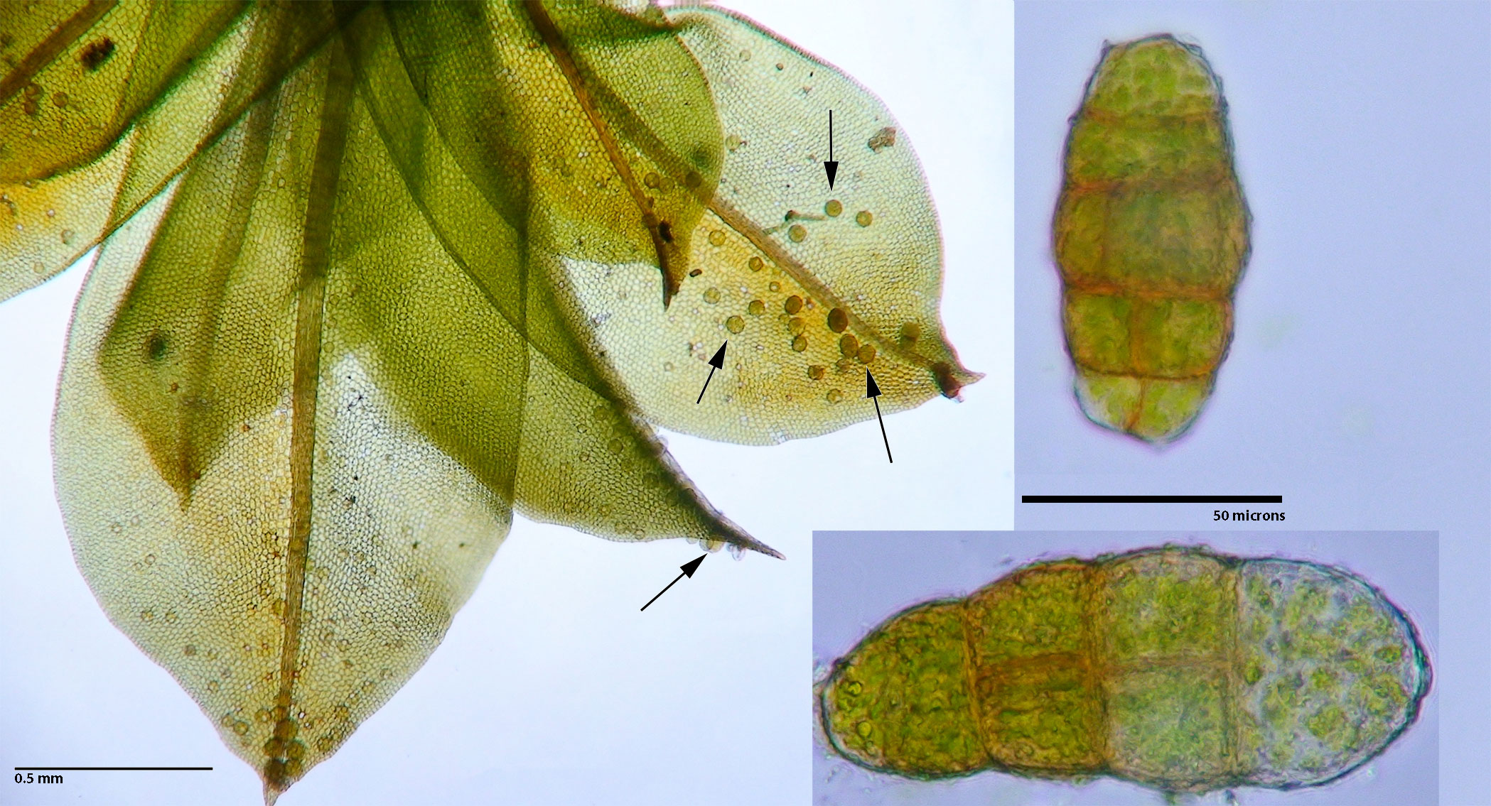 Arrows point to propagula in formation; mature propagula (2) in the insets at right.