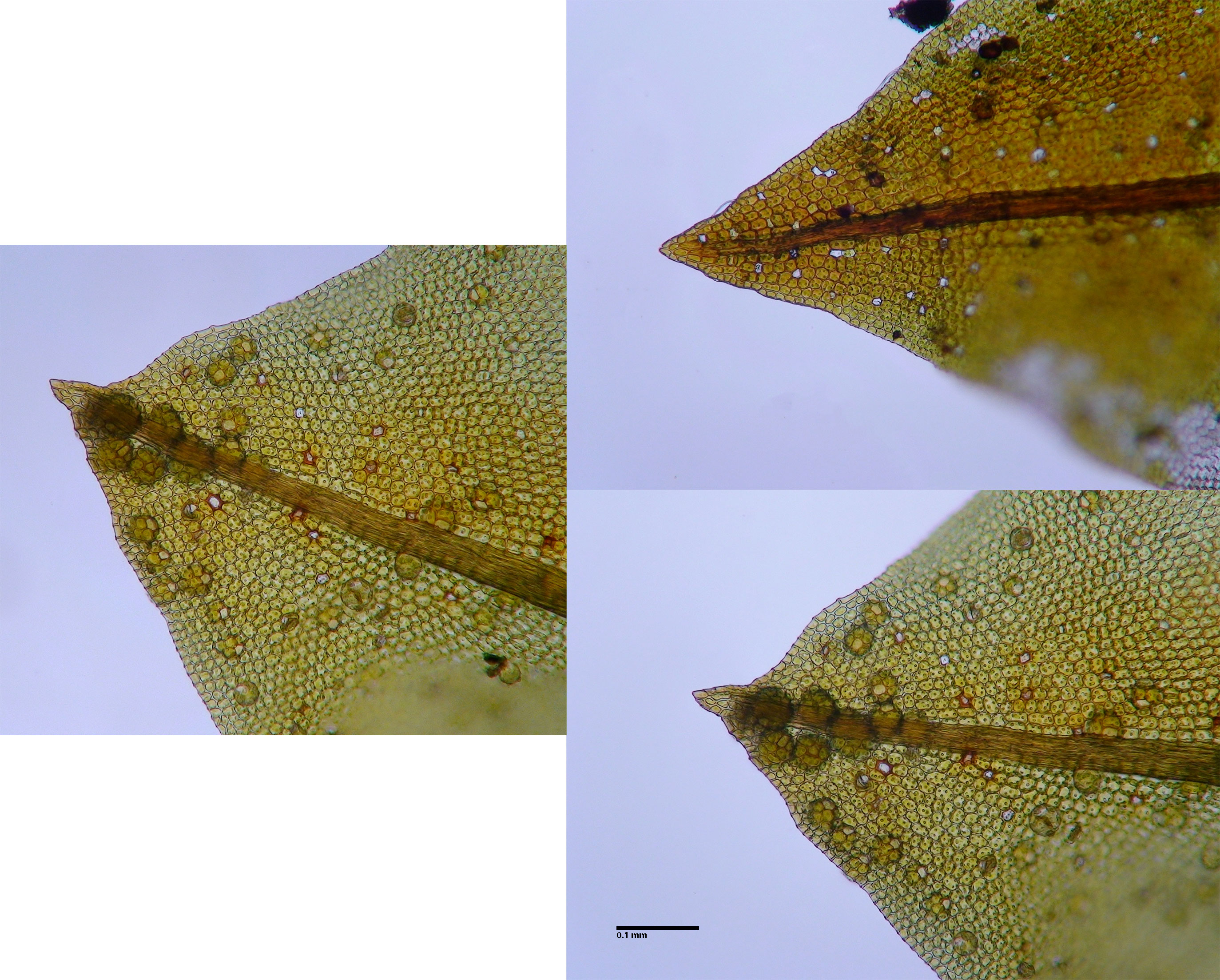 The costa ends a few cells before the leaf apex or extends to the leaf apex, not beyond. The circular areas are points of propagula production.